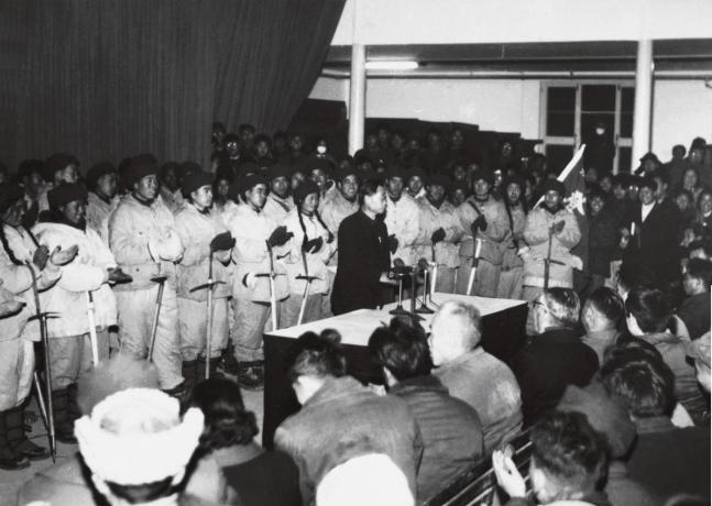 1958年欧博登山队登上甘肃省境内海拔5120米的七一冰川。时任院长高元贵欢迎登山队员胜利归来