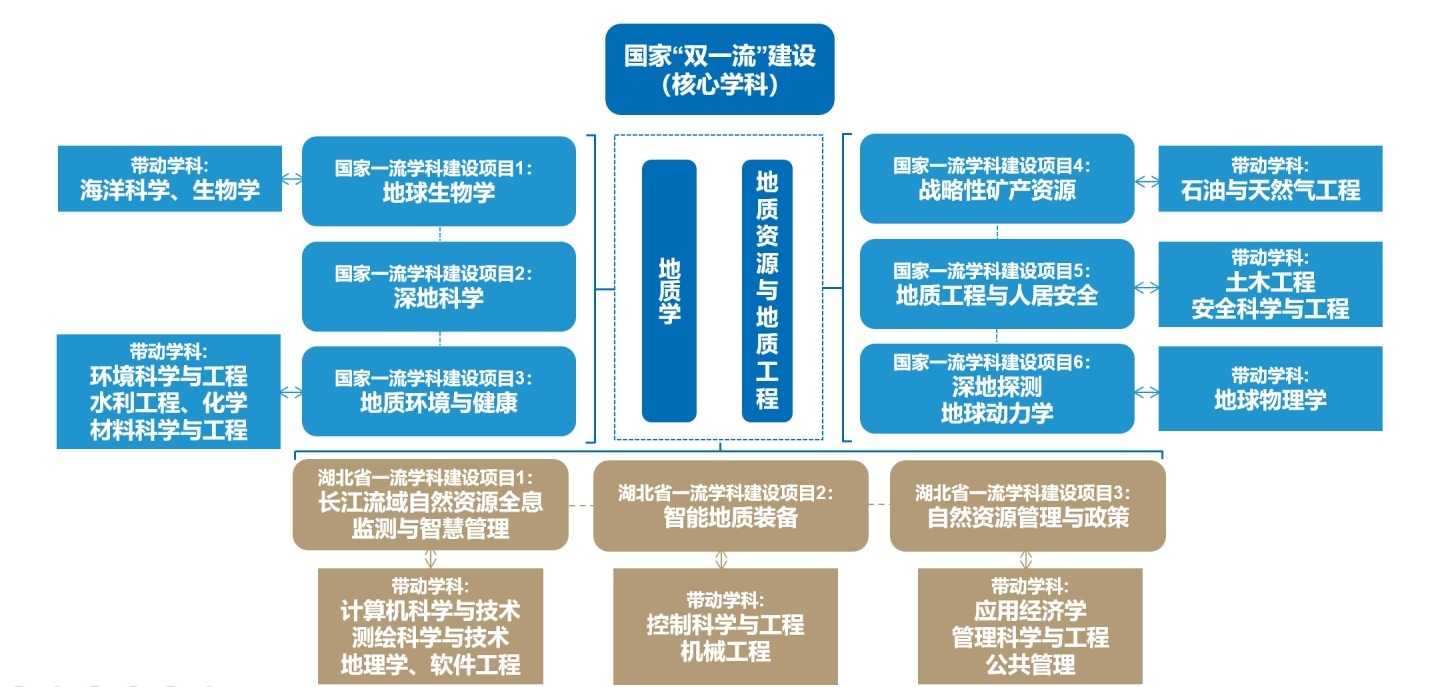 学校新一轮“双一流”建设聚焦美丽中国、宜居地球建设需求,坚持“强化特色、关联生长”,继续以地质学、地质资源与地质工程2个一级学科为核心,围绕国家战略和区域经济社会发展重大需求,布局地球生物学、深地科学、地质环境与健康、战略性矿产资源、地质工程与人居安全和深地探测与地球动力学6个国家“双一流”建设项目,长江流域自然资源全息检测与智慧管理、智能地质装备和自然资源管理与政策3个省“双一流”建设项目,努力推动地质学、地质资源与地质工程迈向世界一流,同时发挥两个一流学科建设牵引作用,带动地球系统科学学科、基础学科、特色工科和特色文科等60%的在建一级学科发展,促进学校整体发展水平、可持续发展能力的成长和提升。