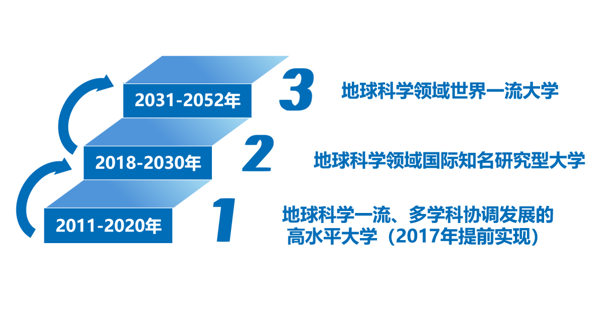 “十二五”规划擘画了“三步走”战略蓝图:第一步,从2011 年到2020年,实现“地球科学领域一流、多学科协调发展的高水平大学”的阶段性办学目标;第二步,从2021年到2030年,把学校建成国内外知名的研究型大学;第三步,从2031到2052年,到建校100周年时,基本实现“建设地球科学领域世界一流大学”的长远办学目标。