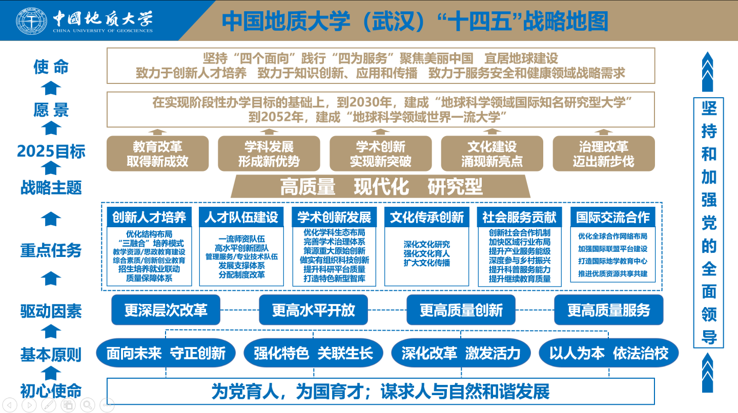 “咬定青山不放松”,学校锚定建设地球科学领域世界一流大学的办学目标,始终保持战略定力,强化战略管理,形成了包括中长期战略规划、五年改革发展总体规划、专项规划、各二级单位规划的战略管理体系,建立了发展规划与年度工作要点相衔接的规划落实体系,形成了上下互动、协同联动,纵向到顶、横向到边的管理格局。