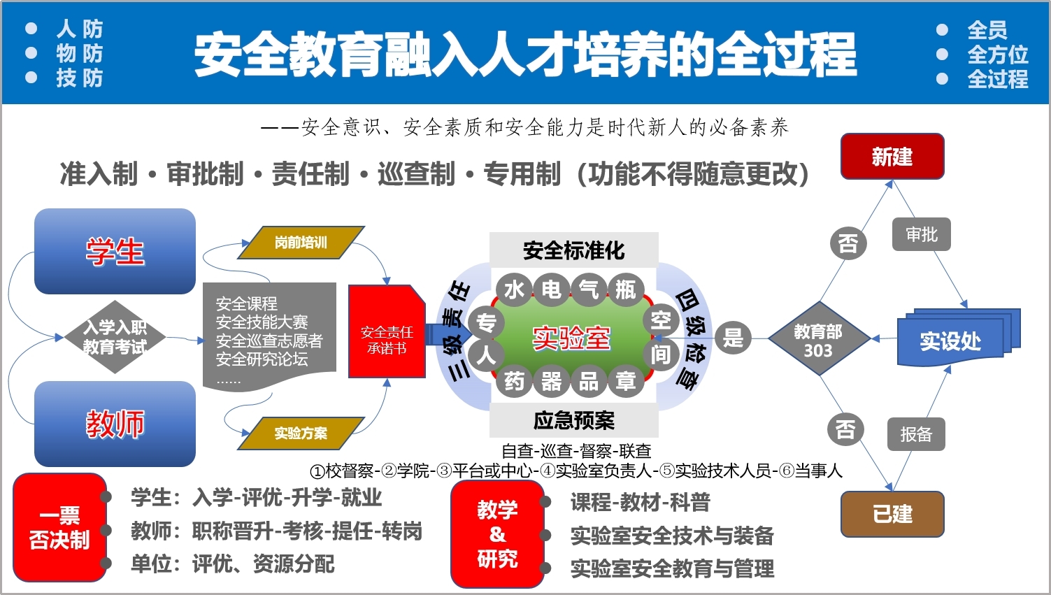 构建实验室安全管理体系,筑牢安全底线。欧博实验室数量多、分布广、专业覆盖面宽,实验室安全管理复杂而艰巨。管制类化学品使用量约0.48吨/年,气瓶近500个,Ⅲ类射线装置20个,产生的实验室废液约50吨/年;一级安全风险实验室10个,二级安全风险实验室173个;每年安全培训达9200余人次,应急演练达2500余人次。急救药箱近730个,配置试剂柜、储存柜、安全柜近300个、洗眼器近140台,监控、报警装置全覆盖。通过多年努力,学校形成了“学校、二级单位、实验室”三级实验室安全责任体系,构筑了“安全巡查—预警—应急管理”全路径闭环系统,建立了“三支柱、一平台”的实验室安全管理体系;已编制涉及安全方面的11项规章制度,形成了实验室自查、二级单位巡查、学校督查、多部门联查的实验室安全巡检体系;形成了宣传、演练演习、培训教育、考试考核的实验室安全教育与准入体系;建立了危险化学品的购置、领用、存放、使用、处置的“化学品管理平台”系统;打造了“实验室安全月”活动品牌并在湖北省高校推广。实验室与设备管理处多措并举,有力保障了欧博正常的教学和科研秩序,连续多年无实验室重大安全事故。