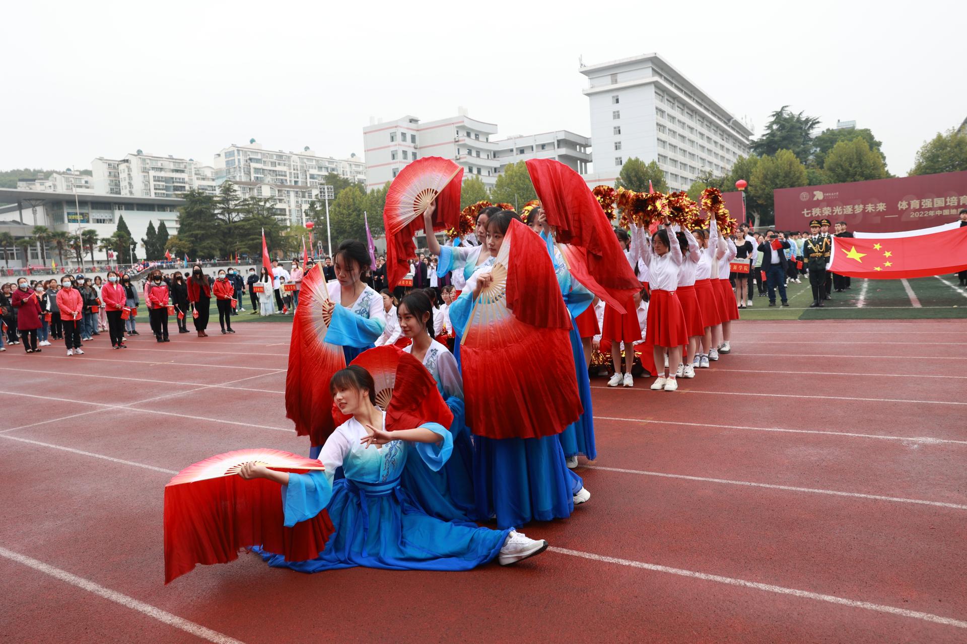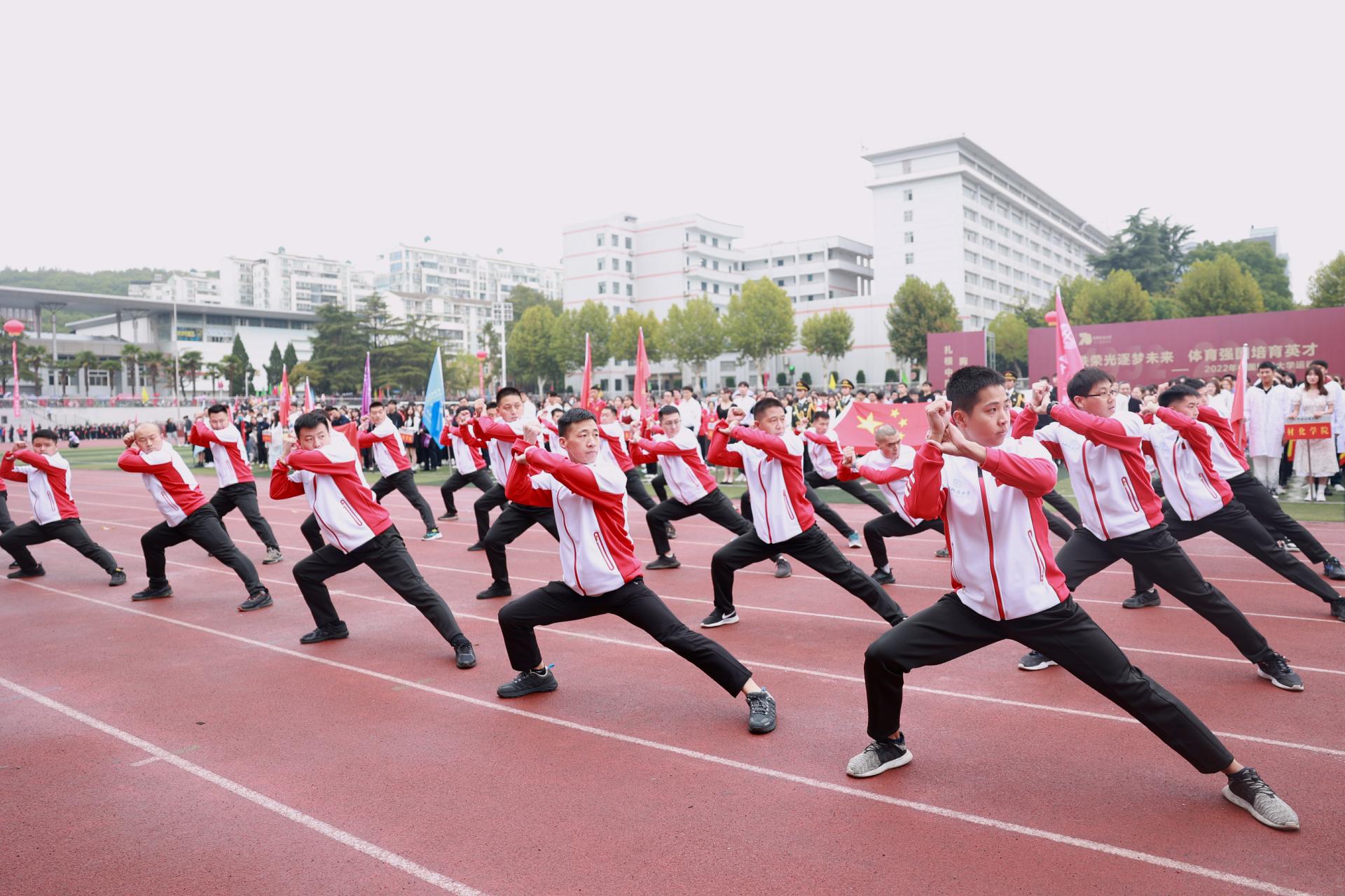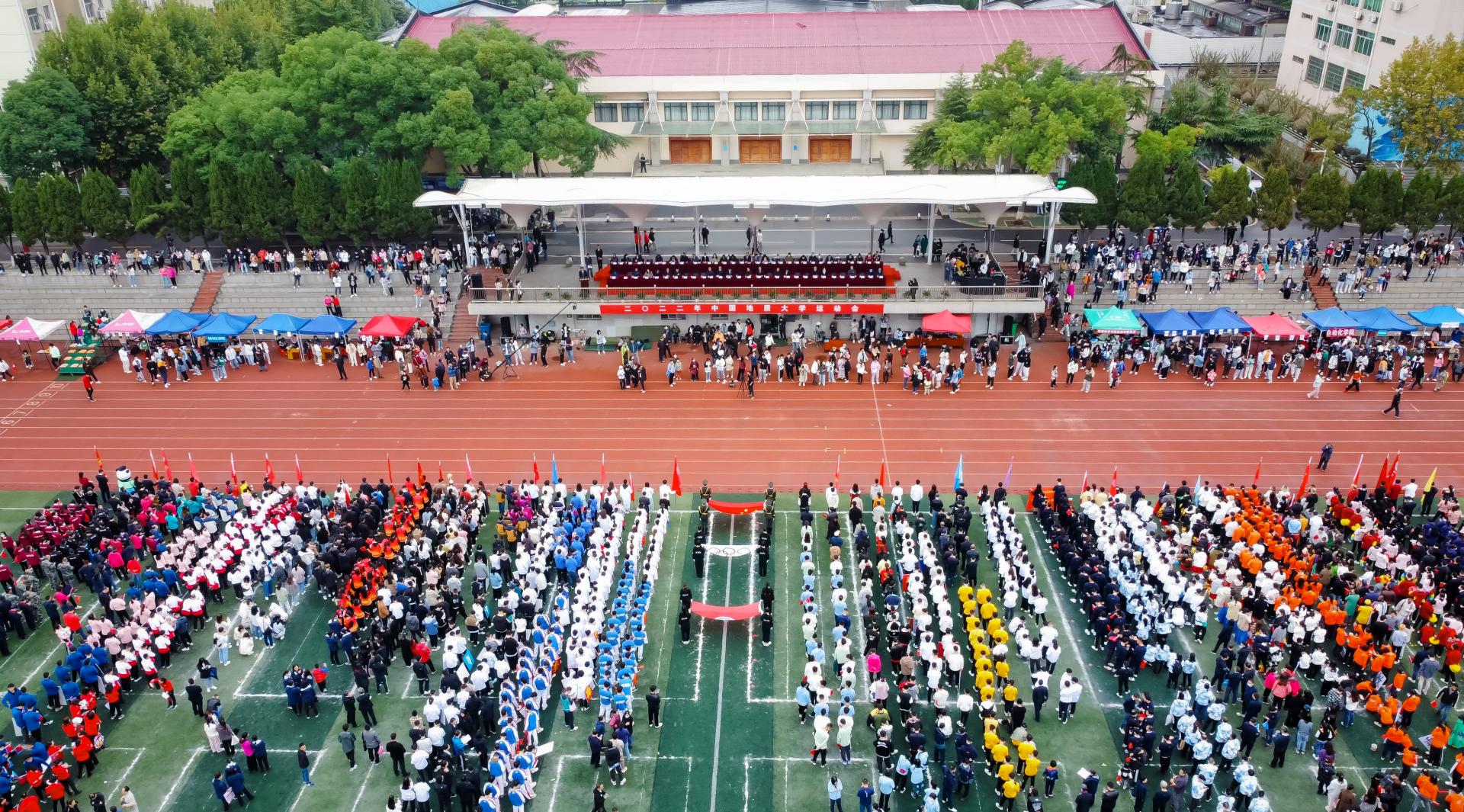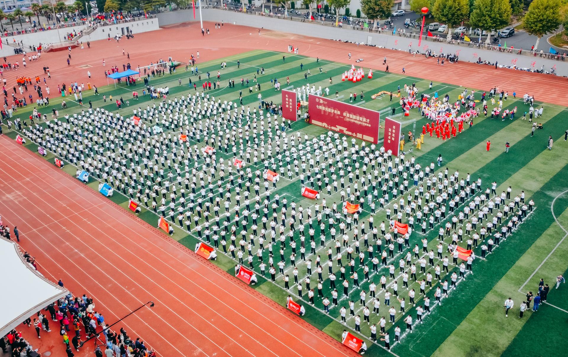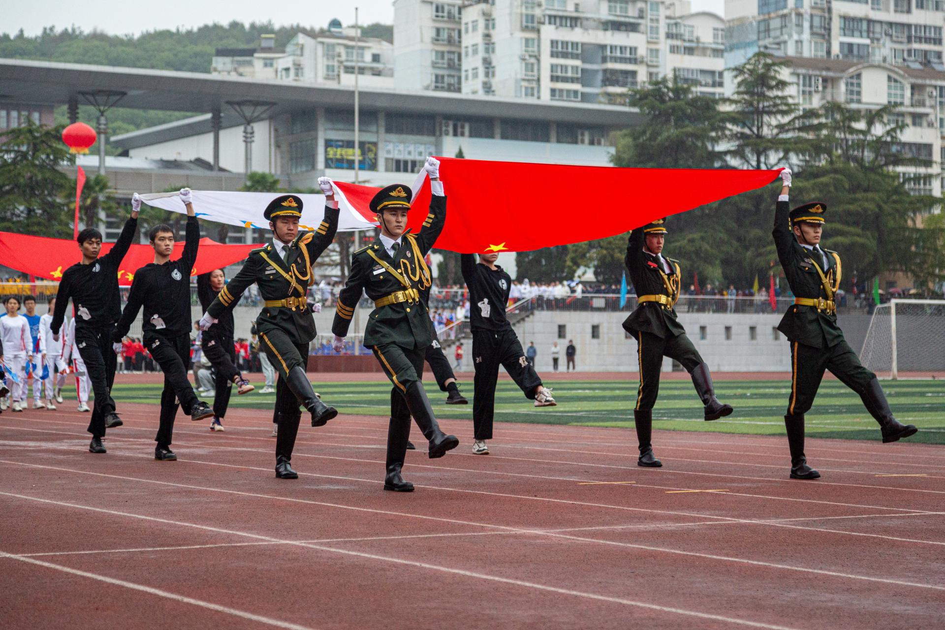 伴随着激昂的音乐,师生们步伐整齐、口号嘹亮、意气风发,依次走过主席台。