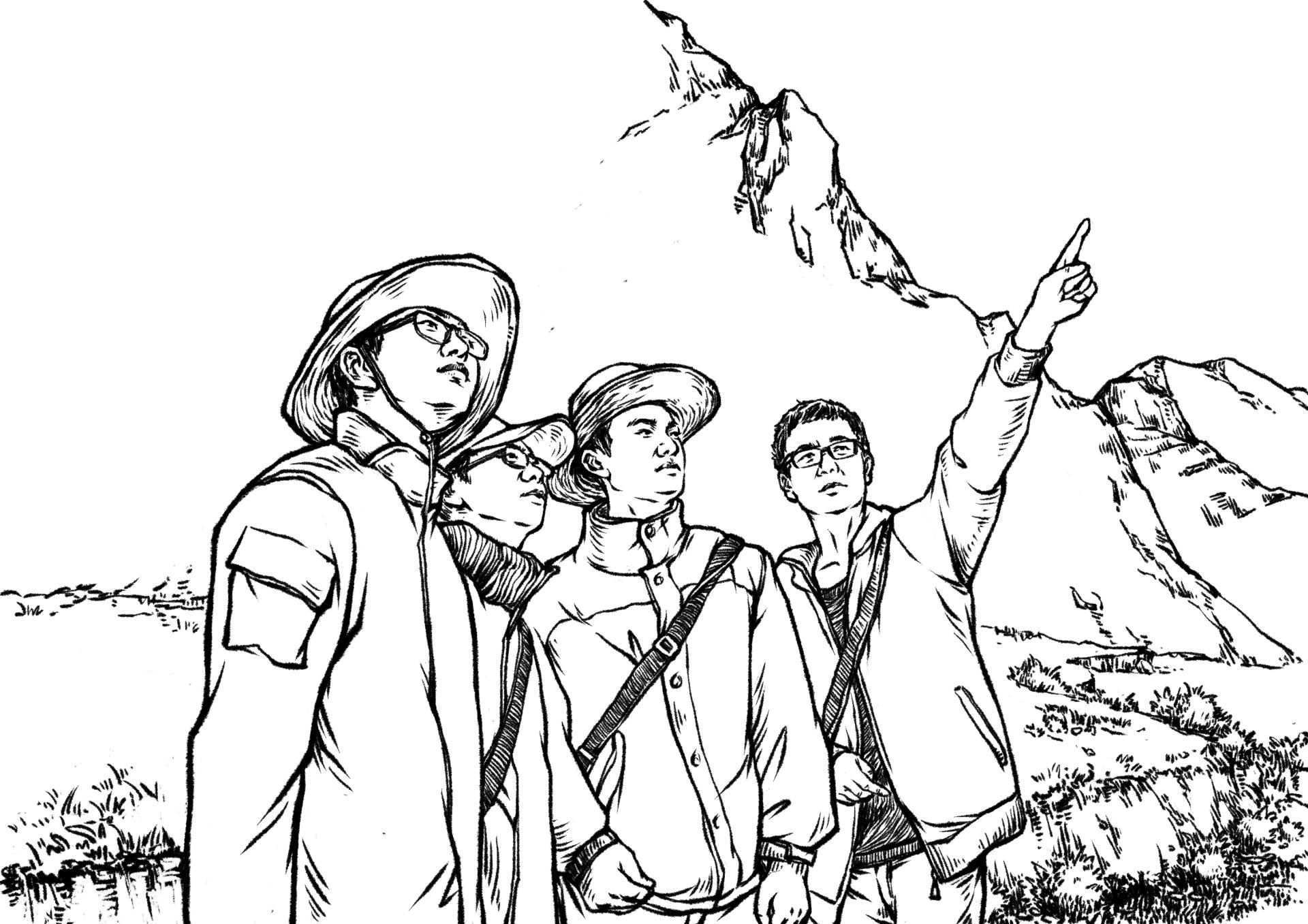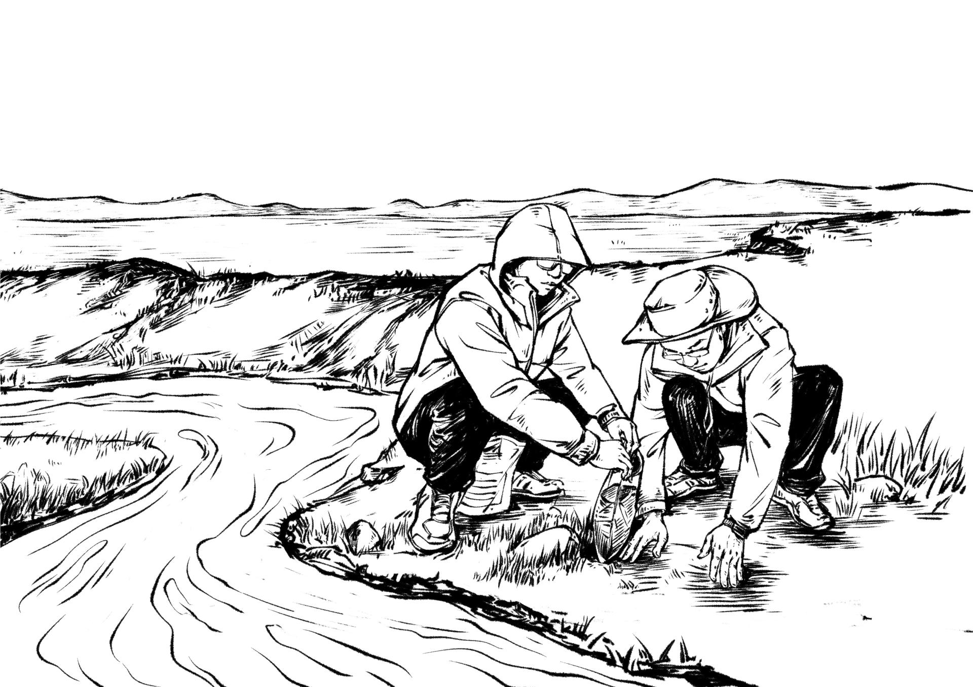 画稿中的所有人物,均以身边的师生为创作原型。“创作这个绘本的过程,也是我的思想接受洗礼的过程,我身边的很多老师和同学,为了探寻自然资源的奥秘,在野外风餐露宿、艰辛跋涉,真正地把论文写在祖国大地上。”参与创作的研究生唐钰君感叹。