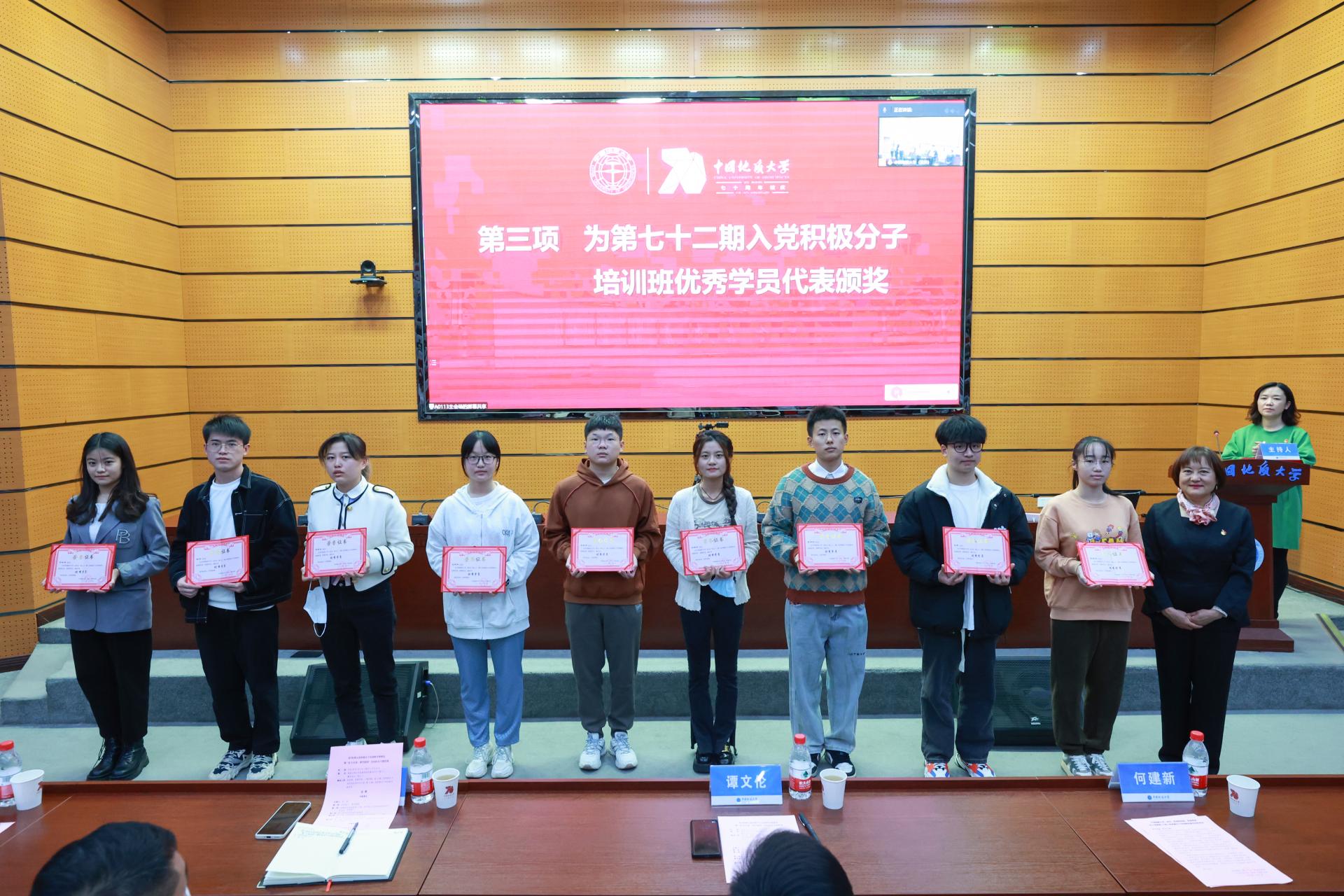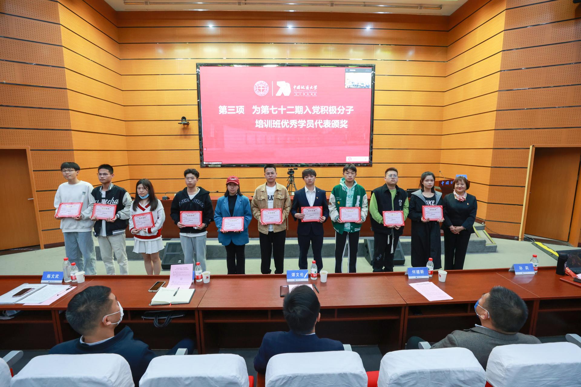 开班典礼上,党委组织部副部长何建新宣读了《关于表彰第72期入党积极分子培训班优秀学员的决定》,陈文武为优秀学员代表颁发证书。