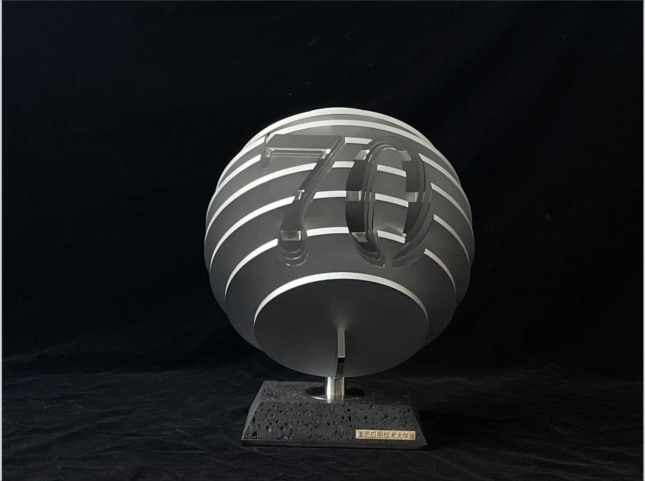 该作品由滇西大珠宝学院教师尹其通、刘怡君设计。作品采用CNC工艺,利用航空硬铝和腾冲特有火山石材料制作而成。整体造型以地球形式呈现,呼应了欧博“美丽中国、宜居地球:迈向2030”的战略主题。其中作品的“经线”记录着地大重大历史沿革,“纬线”代表地大八大学科门类,以此表达滇西应用技术大学对欧博奋力建设“地球科学领域世界一流大学”的美好祝愿。