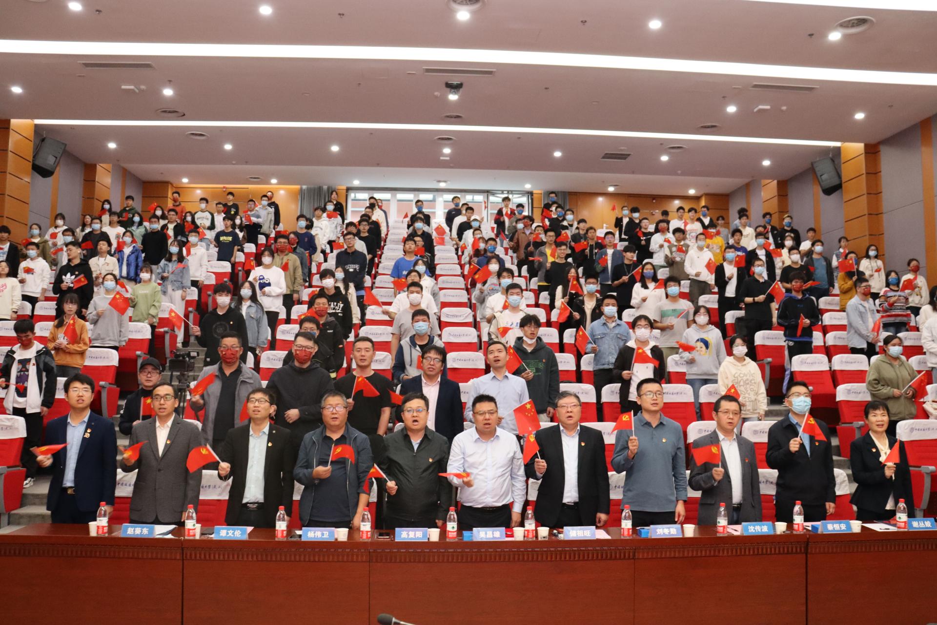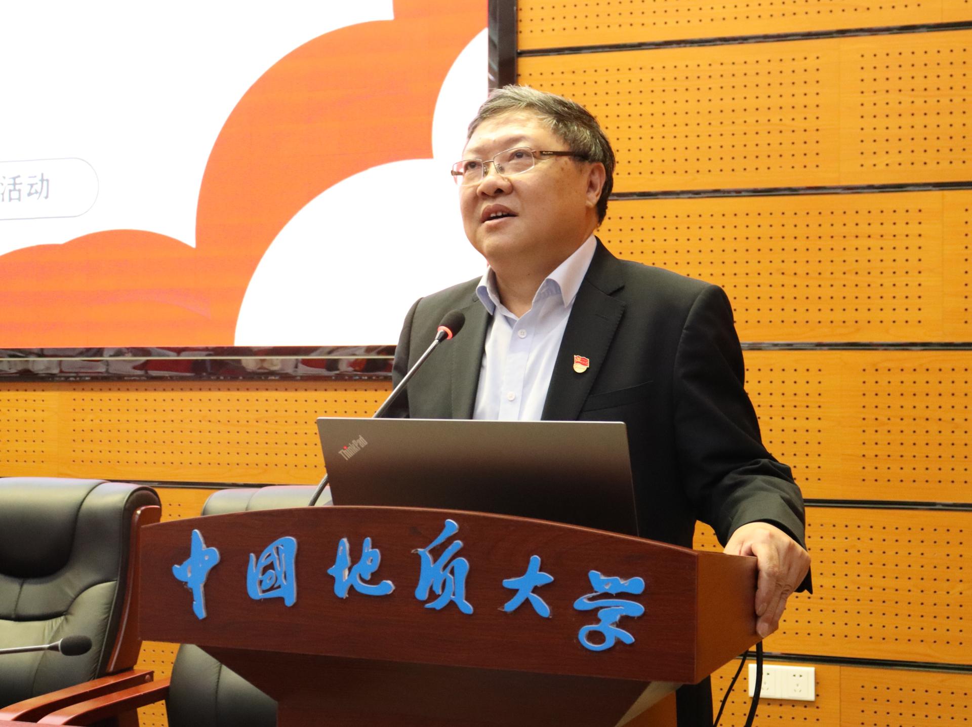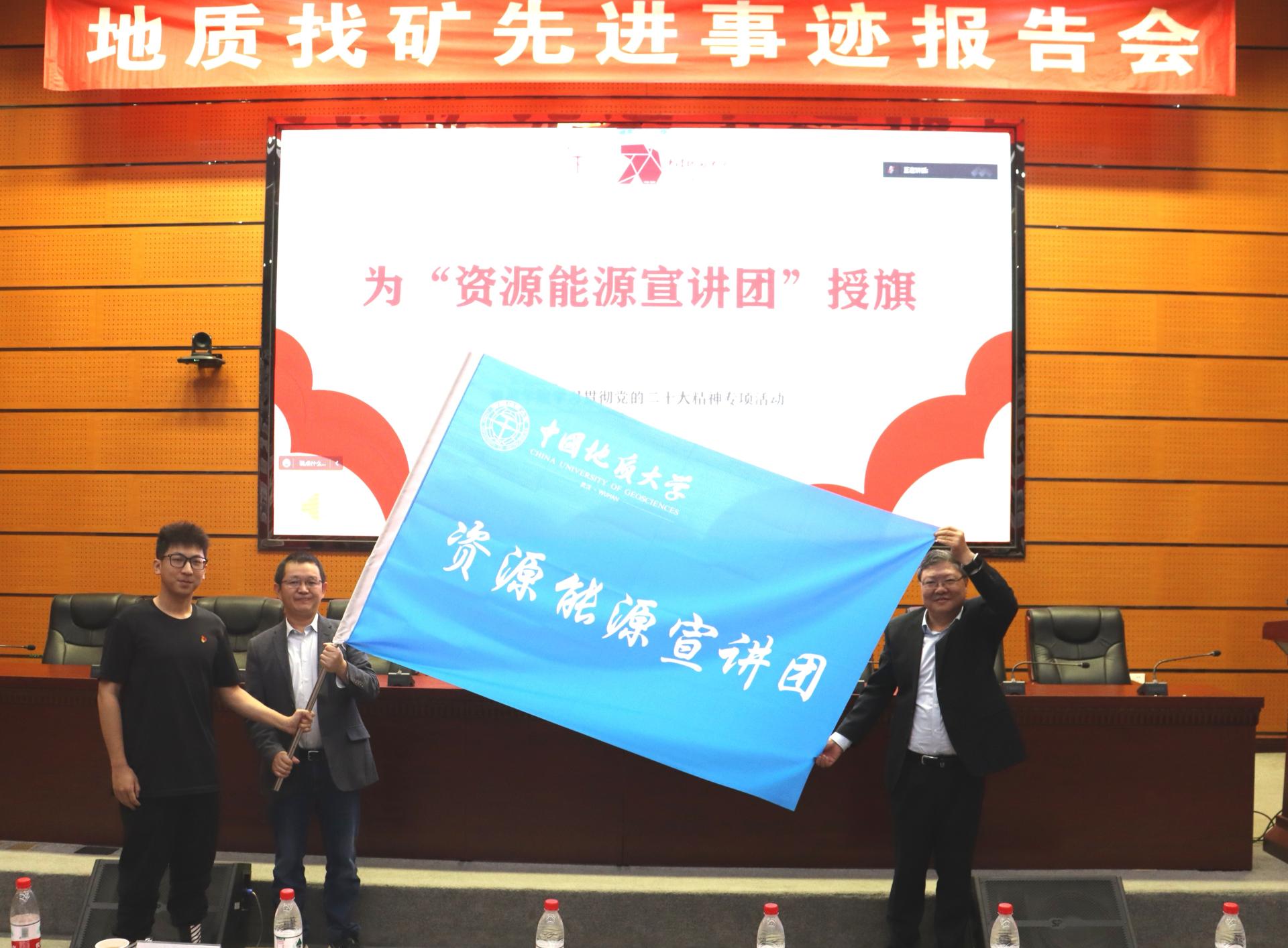 储祖旺为资源学院“资源能源宣讲团”授旗。武汉市委宣讲团成员、资源学院副院长沈传波教授,“志留纪”科普平台负责人、资源勘查工程专业2020级本科生吕骏腾代表接旗。