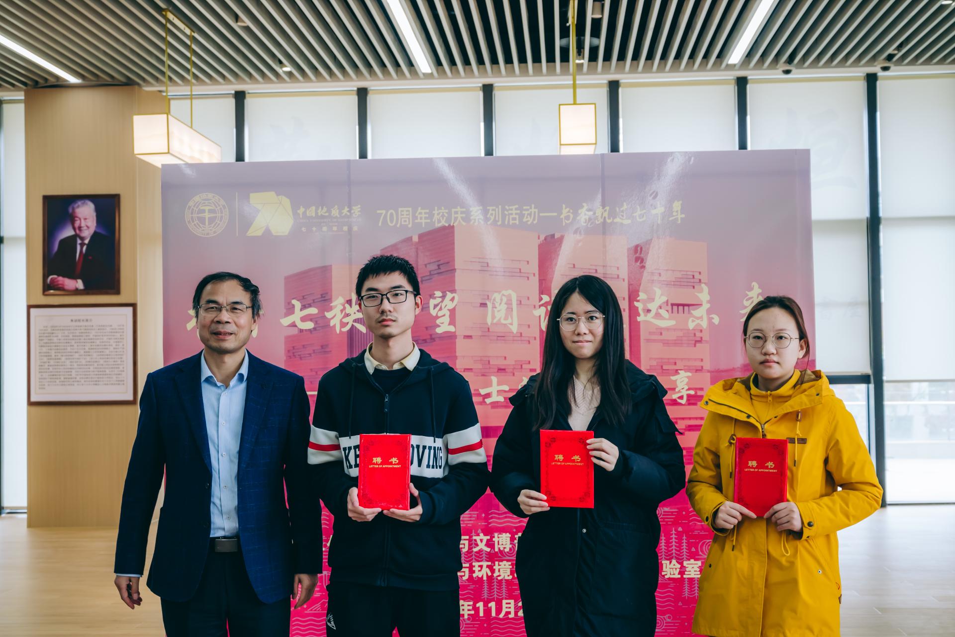 谢树成院士为第二届学生馆长、副馆长颁发聘书。车佩娟被聘为学生馆长,廖云倩、丁远哲被聘为学生副馆长。