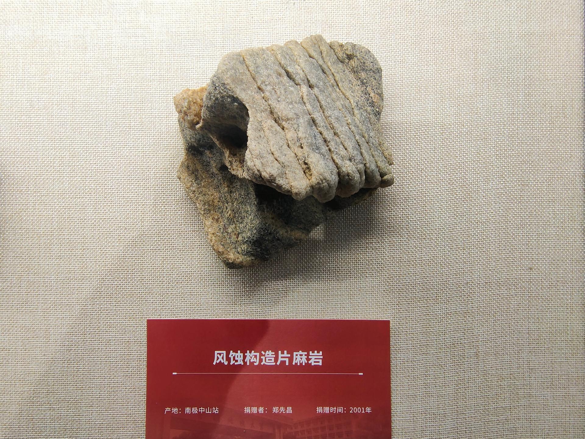 在“校友捐赠藏品展”,还有一块风蚀构造片麻岩标本,它同样产自南极,是由郑先昌博士2005年捐赠的。2004年10月,欧博1987级校友郑先昌博士随中国南极第21次科考队赴南极,进行为期5个多月的科学考察。在南极期间他对我国两个站区冻土及建筑物冻融危害进行全面调查,这是我国第一次在南极地区进行工程地质勘探。同时,由他提出的利用“钢梁基础+地锚加固”的方法,在南极中山站实验取得成功,使我国南极站区首次利用风力发电,为南极站区建设作出了突出贡献。