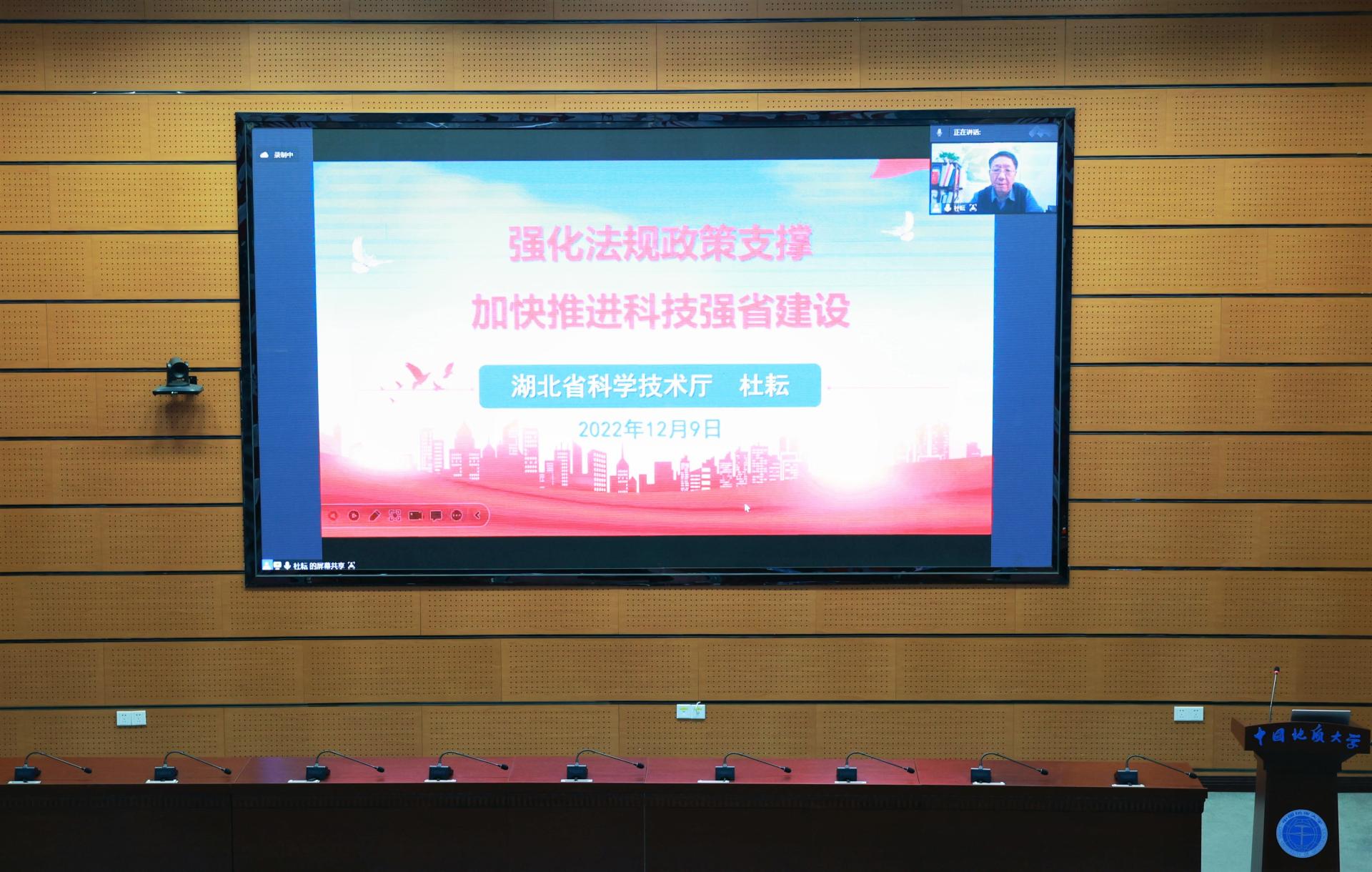 杜耘作题为《强化法规政策支撑 加快推进科技强省建设》的专题辅导报告。他围绕科技创新法规政策的相关情况,从深入学习党的二十大精神新理念、深刻理解《科学技术进步法》新变化、准确把握重点科技创新政策新内容等三个方面进行阐述。