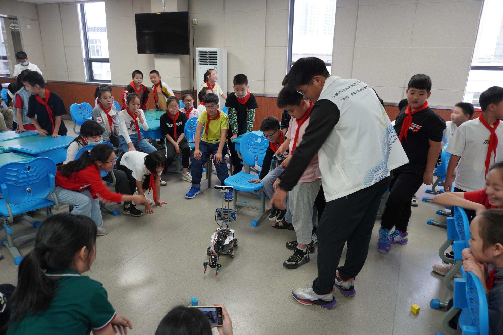 志愿者带领武汉市汉阳区钟家村第二小学的学生操控机器人