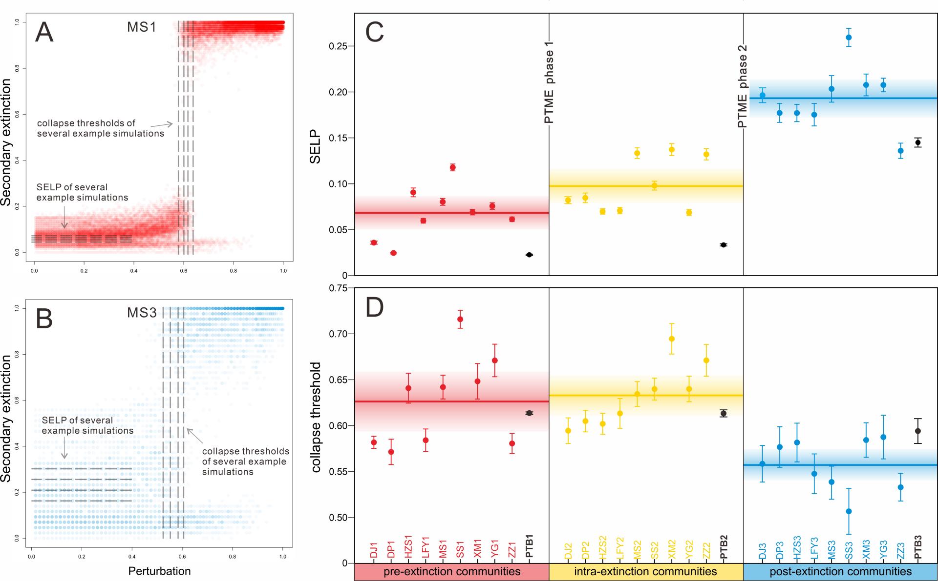 图2.(A-B)煤山金钉子剖面“大灭绝前群落”及“大灭绝后群落”的“波动-次生灭绝”模拟结果图。(C-D)两种定量指标均显示生态系统稳定性在大灭绝的第一幕前后变化不大,却在第二幕之后显著降低。