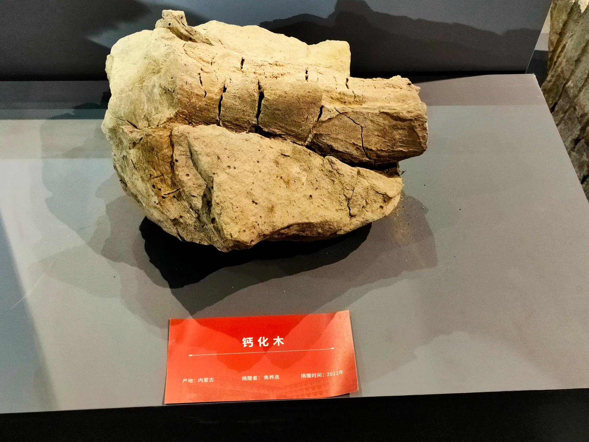 逸夫博物馆四楼“校友捐赠藏品展”展厅展出的这块钙化木化石,来自中侏罗世,产自鄂尔多斯盆地北部鄂尔多斯市东胜区神山沟,由全国模范教师、资源学院焦养泉教授在探查铀矿床时发现,向人们展示了远古鄂尔多斯地区的古植物和矿藏情况。(编辑 孙彦钦 审稿 陈华文)