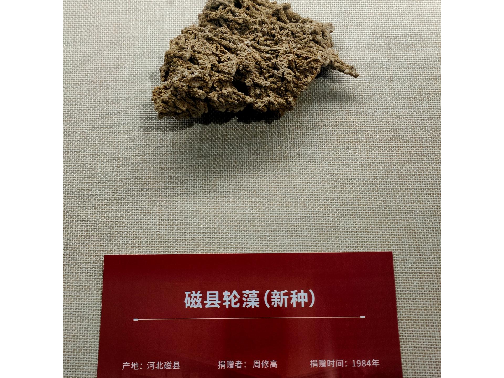 逸夫博物馆的这块轮藻化石是一件正模标本,时代为更新世,由古生物教研室周修高老师鉴定命名为“磁县轮藻”,于1984年捐赠给博物馆。为探究磁县上水石的成因,1984年9月,周修高老师前往磁县东武仕进行了实地观察和采样。根据研究,他推测,在更新世时,磁县西来村至东武仕一带为湖滨沼泽环境,水域中含有丰富的钙质。1986年6月,周修高根据轮藻化石的研究成果在《微体古生物学报》发表。