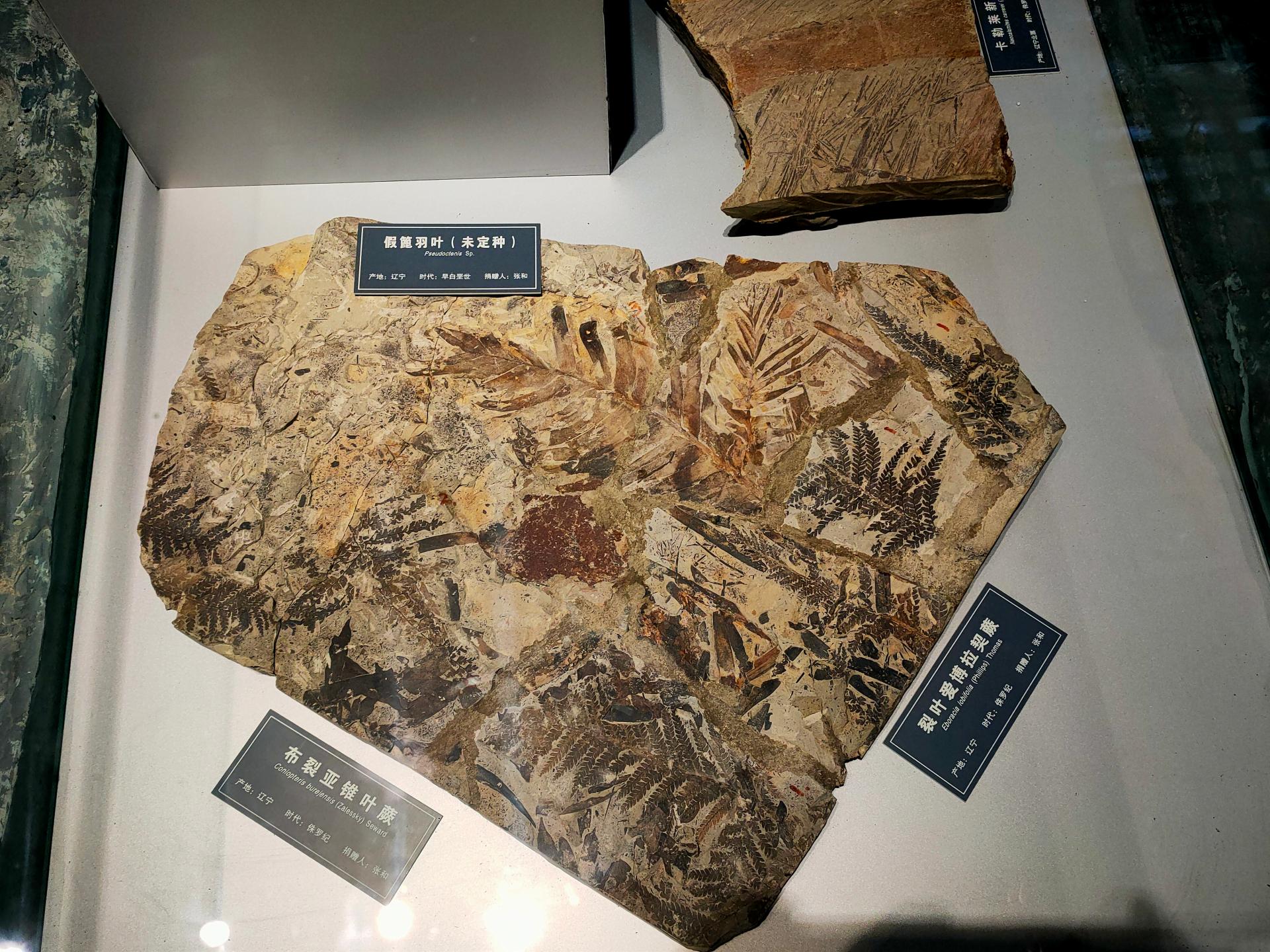 在展厅中央的一块长47厘米、宽43厘米的化石上,簇拥生长着布裂亚锥叶蕨、裂叶爱博拉契蕨和假篦羽叶三种化石。它们各占一端,仿佛互不干扰,却又紧紧相依。
