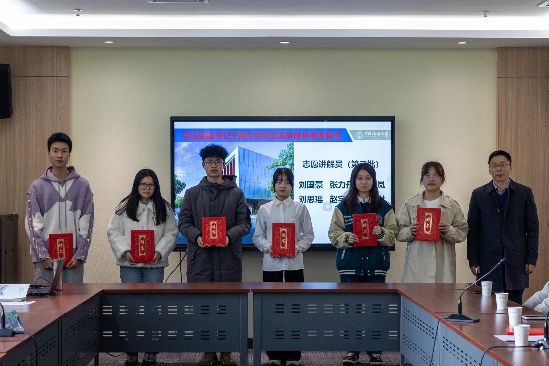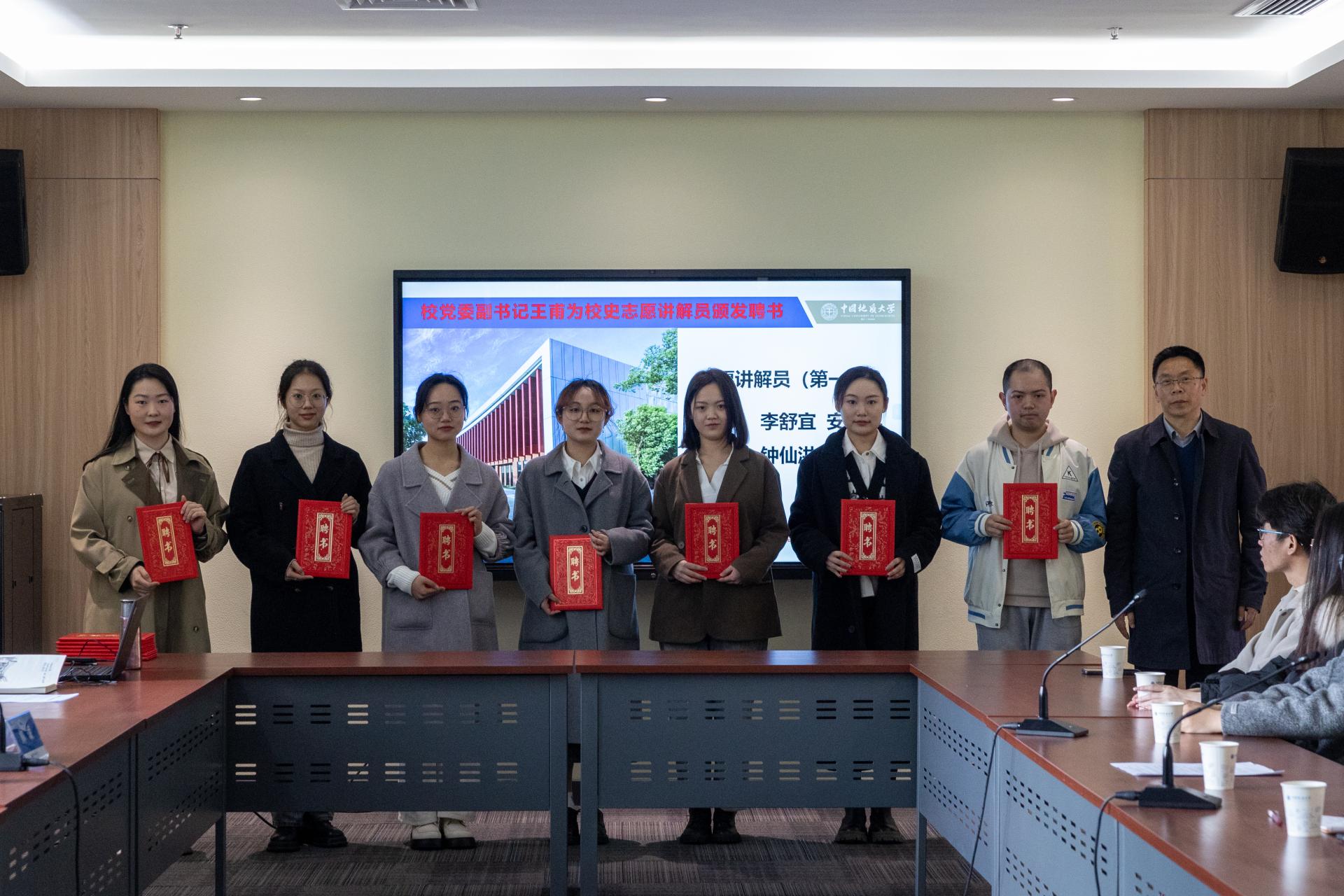 王甫为来自地球科学学院、工程学院、经济管理学院、公共管理学院、珠宝学院、外国语学院、马克思主义学院、教育研究院等单位的13名同学颁发校史志愿讲解员聘书。