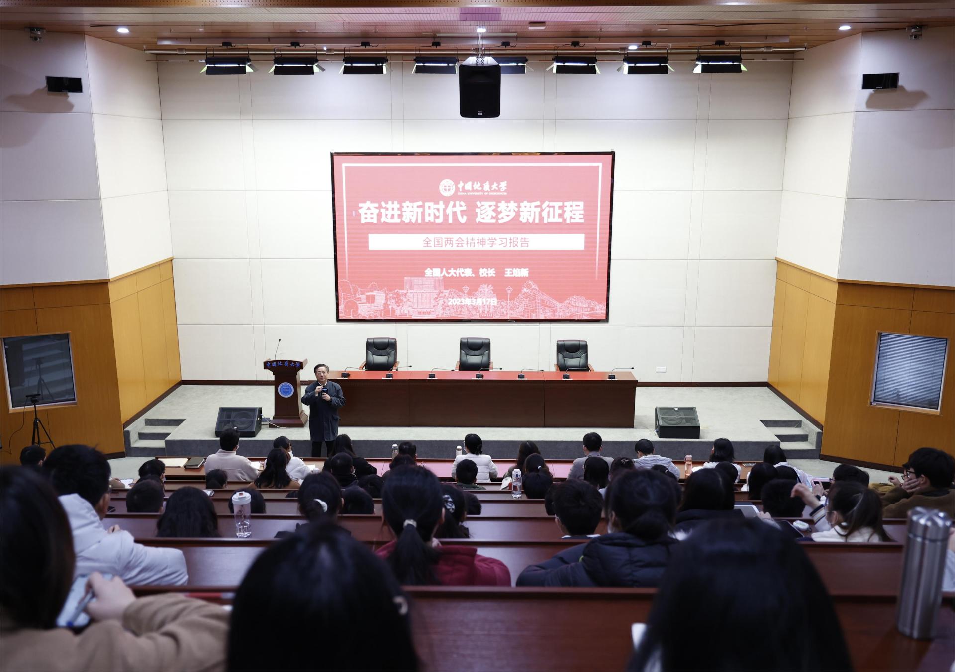 地大新闻网讯(通讯员 熊程 谢鑫滢 摄影 程晓龙)3月17日,全国人大代表、校长王焰新院士以“新征程 再出发 聚焦2023年两会”为题,面向全校师生代表传达全国两会精神,主讲了一堂意义深远、催人奋进的“开学第一课”。