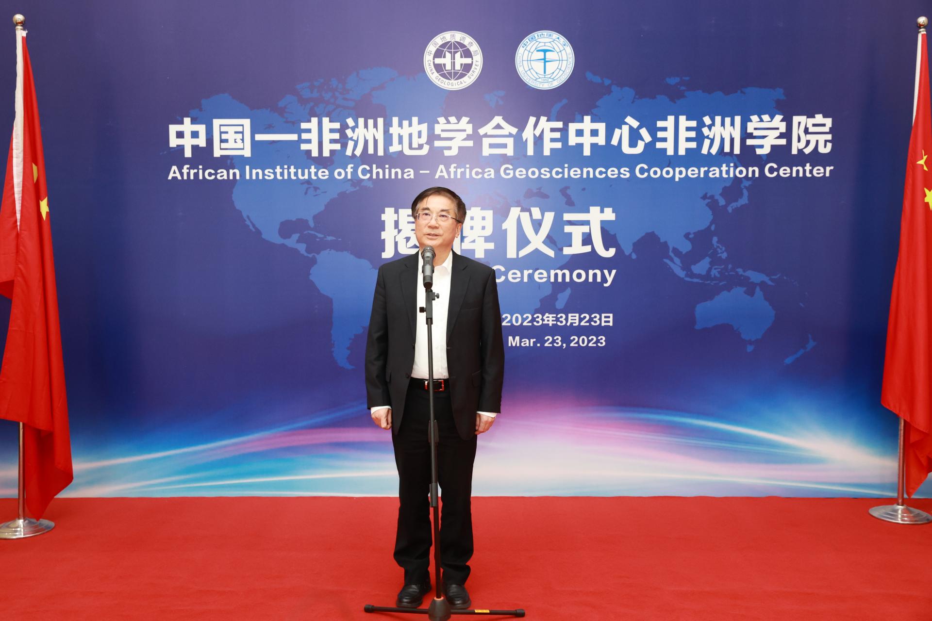 徐学义致辞。他表示,中国地质调查局与地大长期以来深度合作,双方在平台建设、地调研究、人才培养等多方面携手取得了重要成果,堪称合作办学典范。中国—非洲地学合作中心正式成立是贯彻落实中非合作论坛—达喀尔行动计划的重要举措,“非洲学院”作为中国—非洲地学合作中心的重要组成,将为推动中国—非洲人类命运共同体建设贡献智慧和力量。他期望局校双方通力合作,以更高站位、更高标准、更高水平开放办好非洲学院,着力培育一批知华、友华、爱华的管理和技术人才,将“非洲学院”建设成为中国与非洲国家科技、人文交流与合作的重要窗口,成为具有重要影响力的国际合作平台,扩大在非“朋友圈”,在服务“一带一路”倡议和人类命运共同体建设过程中做出新的更大的贡献。