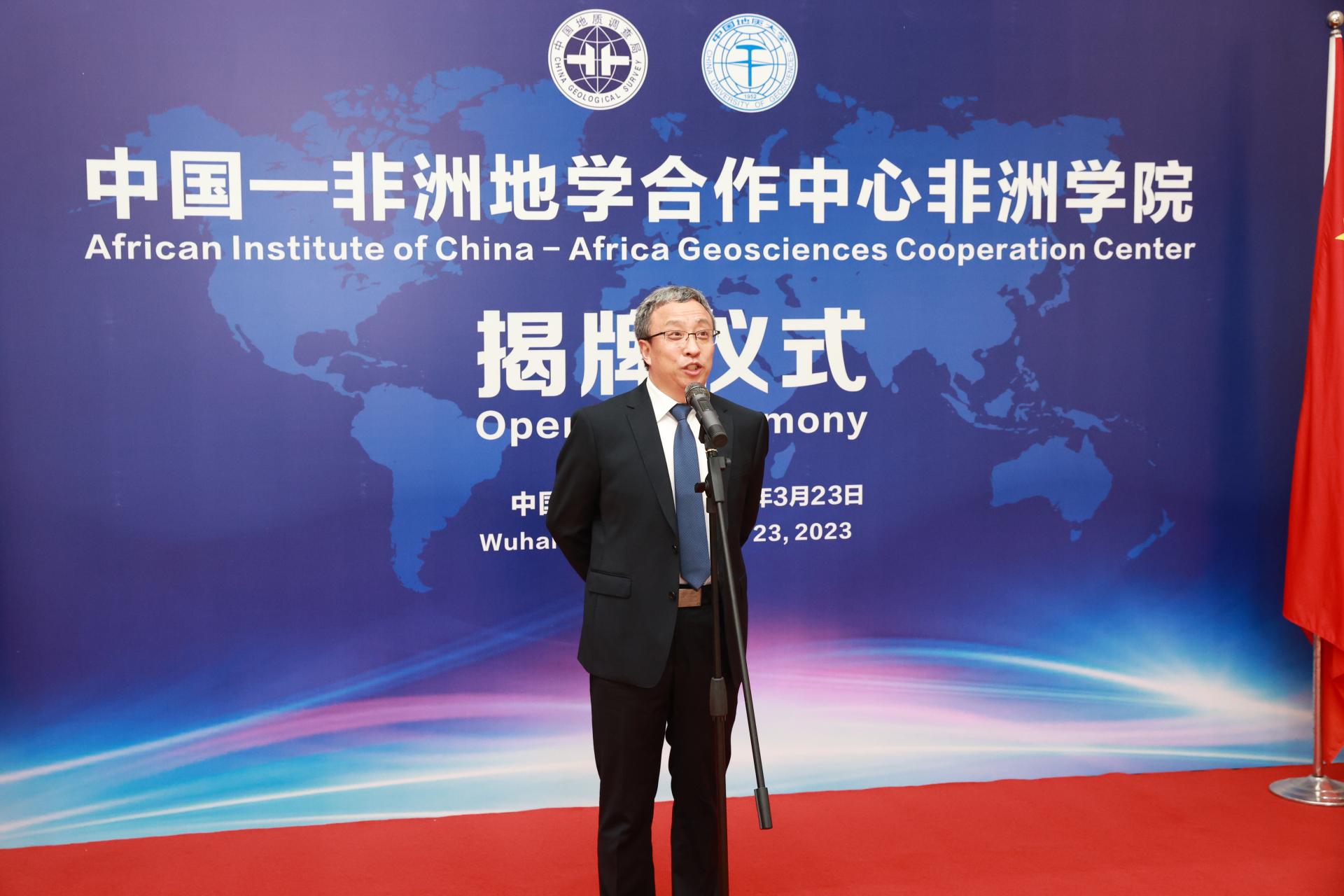 王焰新致辞。他说,习近平主席着眼人类前途命运及中国和世界发展大势,提出“一带一路”倡议以来,高质量共建“一带一路”蹄疾步稳、捷报频传。“非洲学院”的揭牌,为“一带一路”建设再播下友谊、发展、共赢的种子,它标志着欧博与自然资源部中国地质调查局合作登上更大舞台。王焰新表示,当前,“一带一路”沿线国家地质、资源、环境等仍处于开发利用和治理的初期阶段,亟需相关领域人才。地大作为高等地质教育国家队,要坚持教育先行,瞄准“一带一路”建设发展的人才需求,通过深度融合行业特色,整合各方资源,汇聚平台优势,拓展科学研究领域,扩大教育交流合作,引领地学方向国际化高水平人才培育,加强“非洲学院”建设,支撑中国—非洲地学合作中心长期稳定发展,持续打造地学合作研究和人才培养高地。