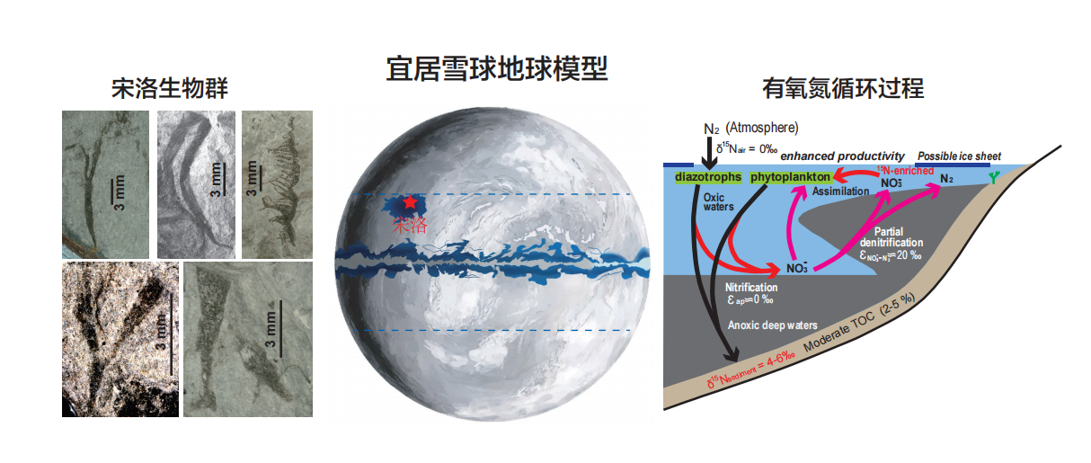 童金南教授团队的叶琴博士,于2015年在《地质学》杂志上报道了产自华南神农架地区宋洛剖面南沱组(6.35亿年前,马里诺冰期时期)的黑色页岩地层中的宏体碳质压膜化石,其中部分被解释为底栖宏体藻类(图1c),被称为“宋洛生物群”,填补了成冰纪雪球地球时期宏体古生物化石空白。但是“宋洛生物群”的古海洋环境背景是怎样的?在“雪球地球”中如何为生物提供宜居场所?这些科学问题都尚未解决。