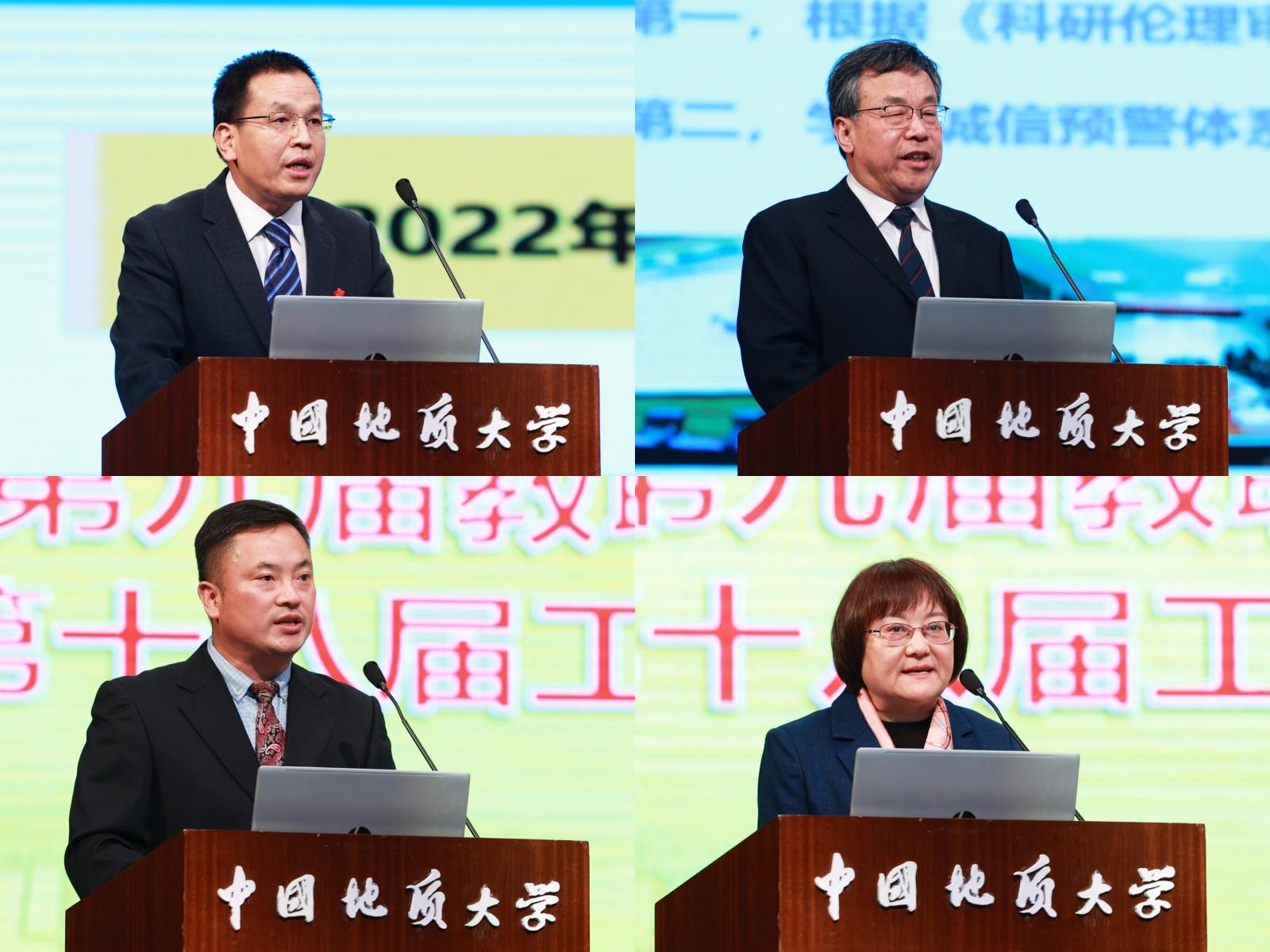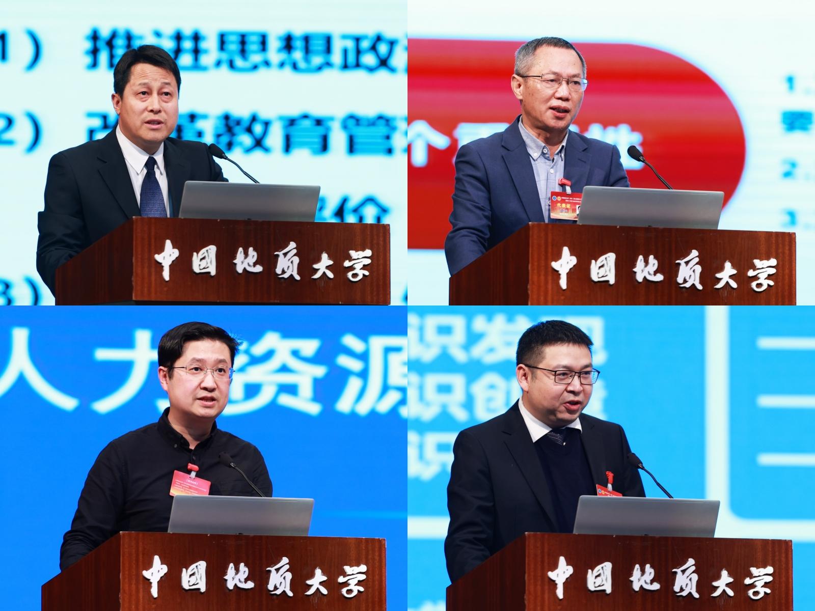 财务与资产管理部部长杨从印、校学术委员会主任童金南、校教代会提案工作委员会主任杨世清、机关党委书记陈文武分别发言,围绕2022年度学校财务工作、校学术委员会工作、九届四次教代会提案办理情况和代表意见建议办理情况等进行专题汇报。