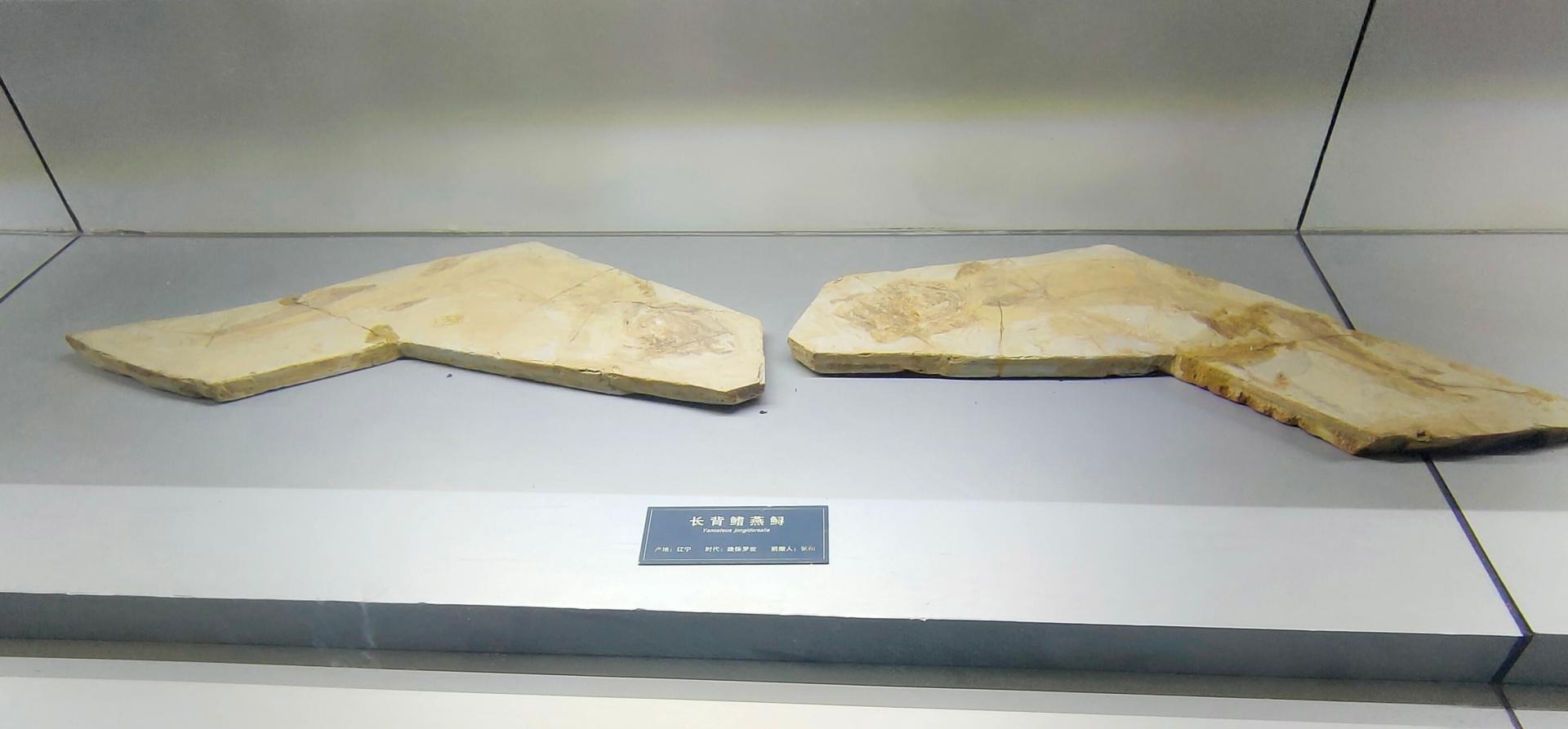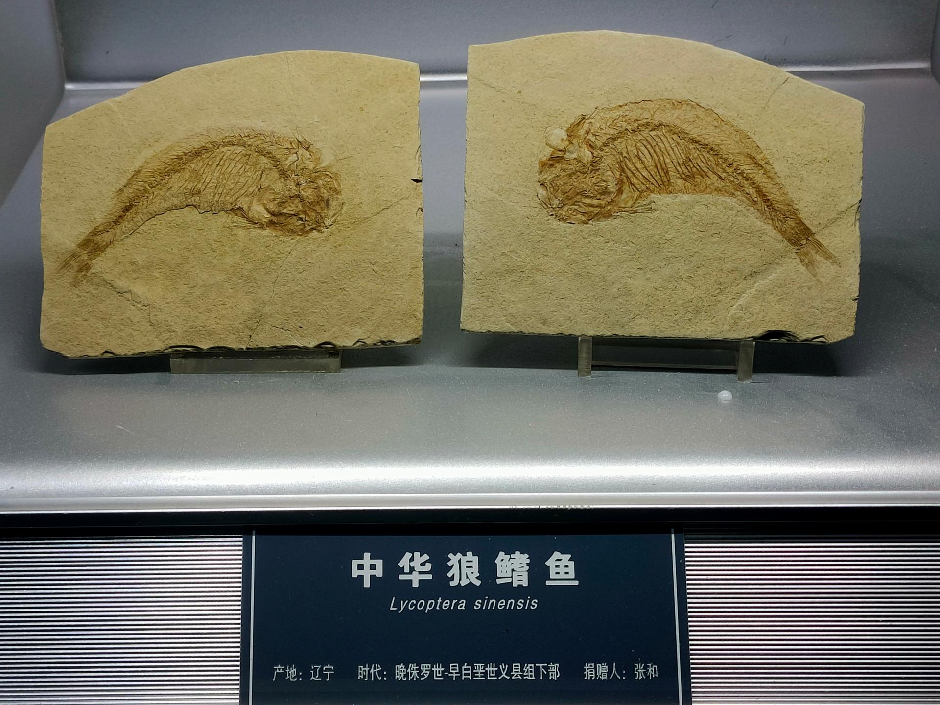 逸夫博物馆珍藏的这两块中华狼鳍鱼化石,呈对称形状,由一条中华狼鳍鱼化石上下剖开形成的正、负模,保存完整,由著名古生物化石收藏家张和先生捐赠。