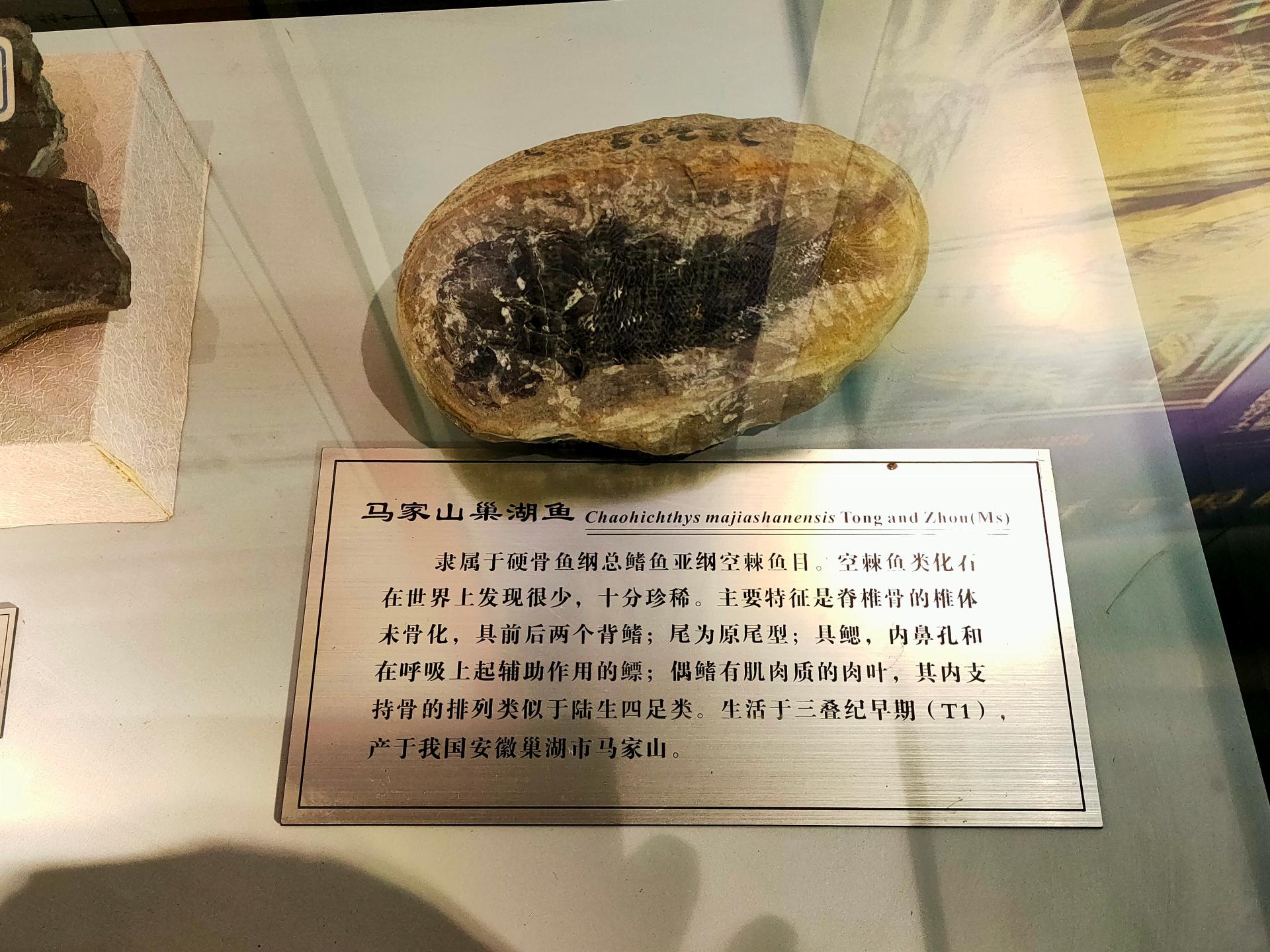 2006年,安徽巢湖下三叠统报道了空棘鱼的一个新属种,即马家山巢湖鱼。逸夫博物馆这条马家山巢湖鱼化石由童金南教授在安徽从事科考工作时发现,并捐赠给地大。从这条马家山巢湖鱼看到,它头骨呈长梭形,体长11cm,两侧对称,鱼鳞清晰可数,保存完整且精美,年代为三叠纪早期。
