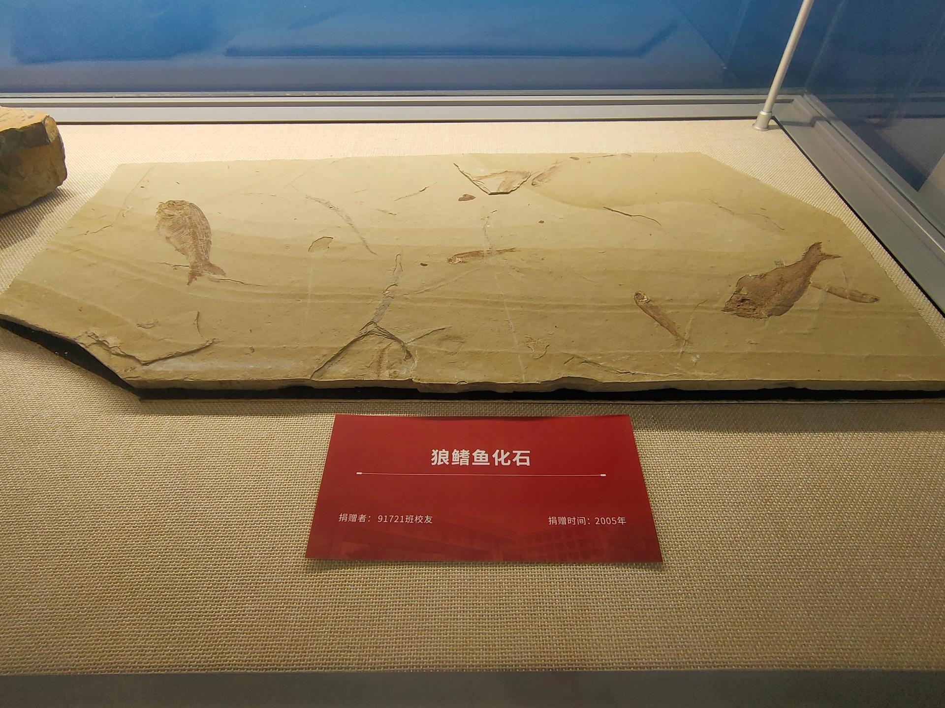逸夫博物馆珍藏有70余块狼鳍鱼化石,其中,中华狼鳍鱼标本近40块,戴氏狼鳍鱼标本30余块。在这块由欧博91721班校友捐赠的,不到0.5平方米的狼鳍鱼标本上,密布着近10条狼鳍鱼化石,正以其生动的姿态,向人们述说着它们不幸的遭遇。