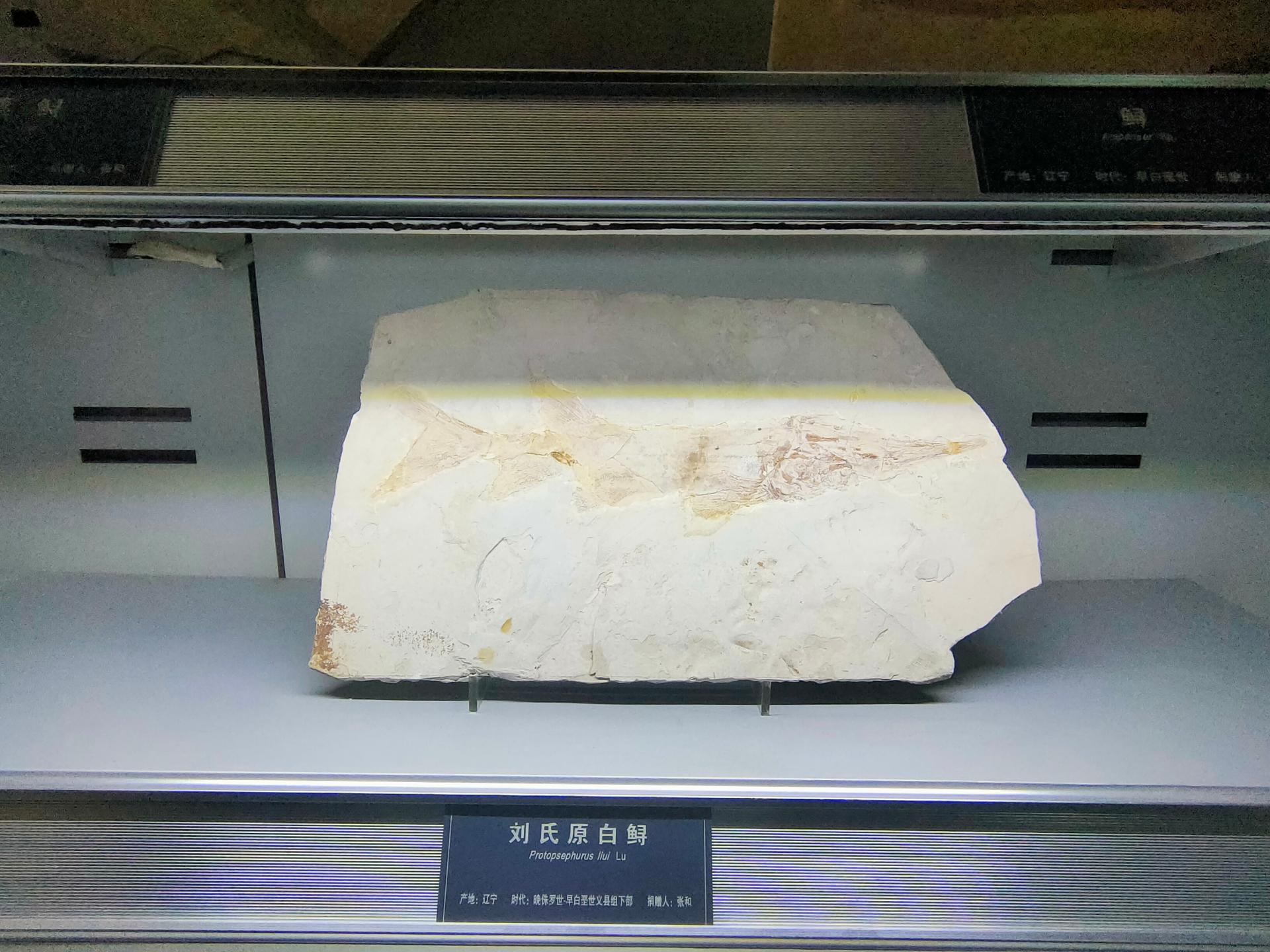 从逸夫博物馆珍藏的这块刘氏原白鲟化石看,和我们见到的中华鲟极为相似。身体呈纺锤形,身上密布齿状鳞片,尾鳍上下叶近对称发育,全长65厘米、宽18厘米、厚1厘米,由张和先生捐赠。