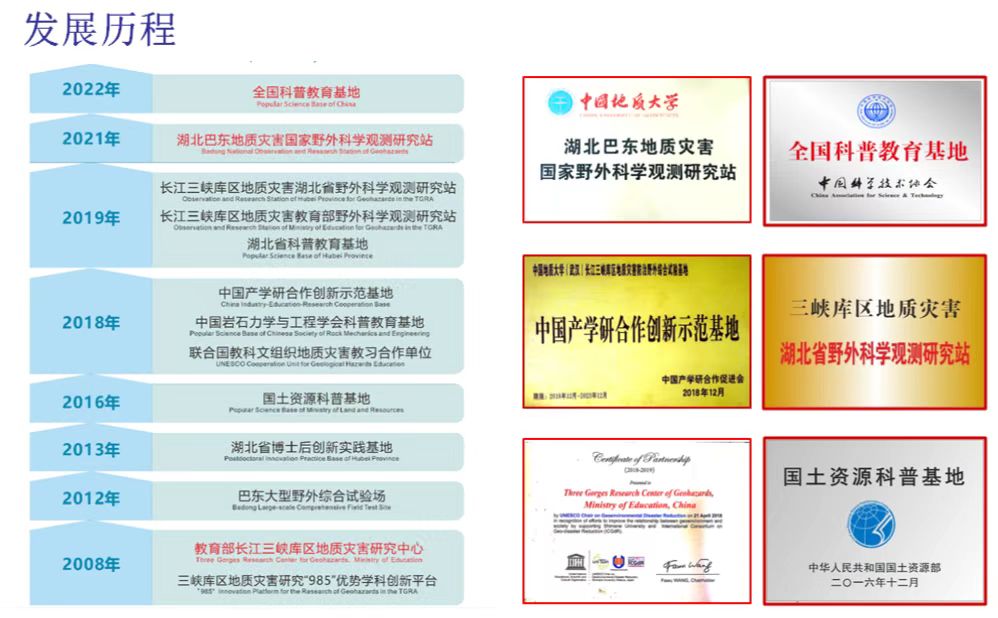如今,历经多年建设,国家野外站已得到业界的广泛认可,获批国家野外科学观测研究站、科技部国家科技合作示范基地、国家“111计划”重大地质灾害预测与防控学科创新引智基地、联合国教科文组织地质环境减灾教席项目国际协作单位、中国产学研合作创新示范基地、教育部野外科学观测研究站、湖北省博士后创新实践基地、湖北省野外科学观测研究站等。