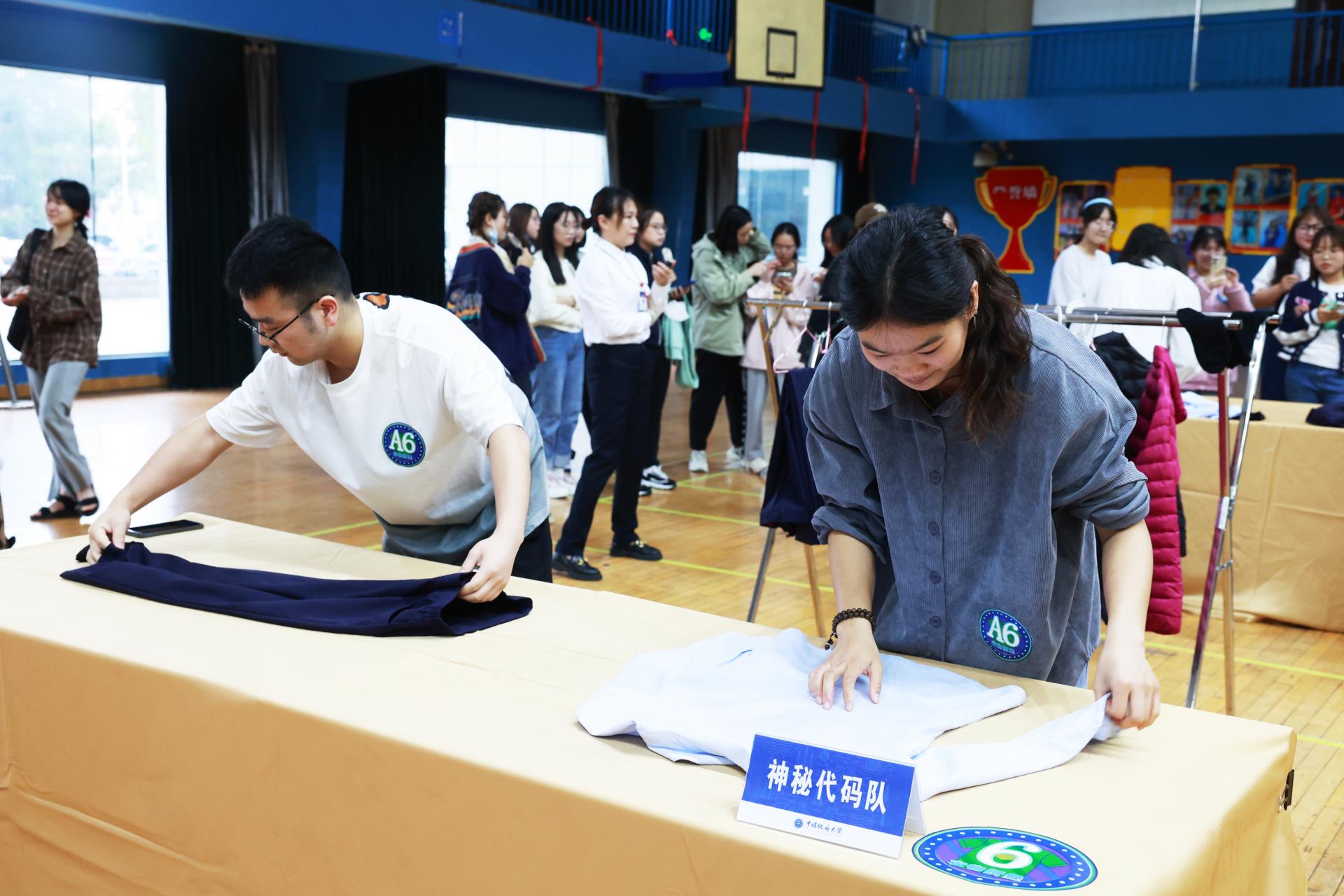 比赛设置中式铺床及衣物折叠两个项目,先由后勤保障部工作人员进行示范讲解,同学们观摩后动手实践,进行现场比赛,现场气氛非常热烈。“哇,平时觉得好难的套被子这么容易就完成了”“整套动作也太快了吧,我都不敢眨眼睛,生怕错过了一个环节”“衬衣居然能叠成方块!也没有想象中那么难啊”……在观看展示环节,工作人员的专业度和熟练度让同学们惊叹不已,鼓掌声不绝于耳。