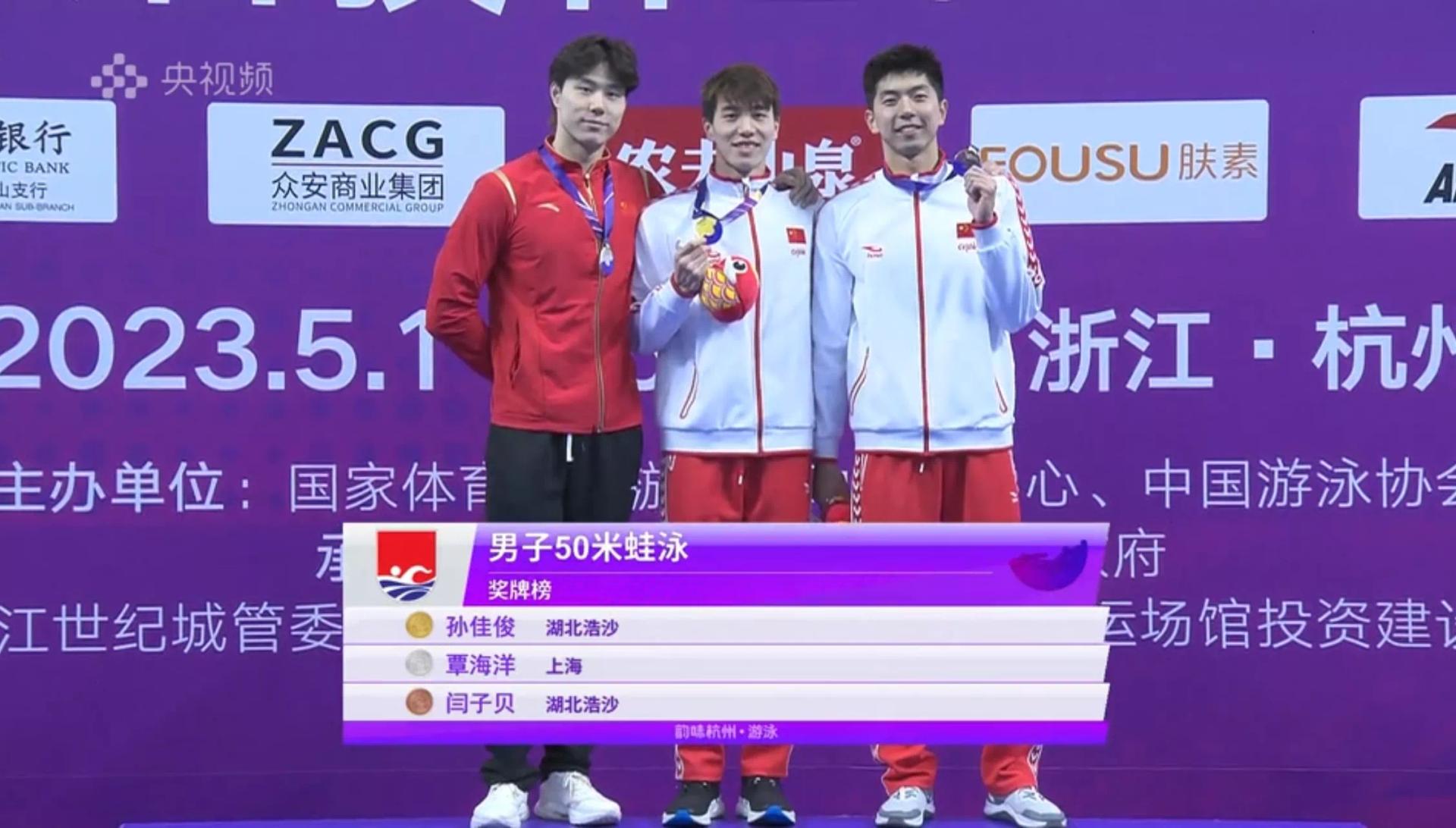 男子50米蛙泳决赛中,孙佳俊、闫子贝与上海队覃海洋展开龙虎大战,三人全程齐头并进,最后的抢边冲刺中,孙佳俊手更快,以26秒61夺金,打破覃海洋保持的亚洲纪录,覃海洋和闫子贝分别以26秒72、27秒09分获银铜牌。
