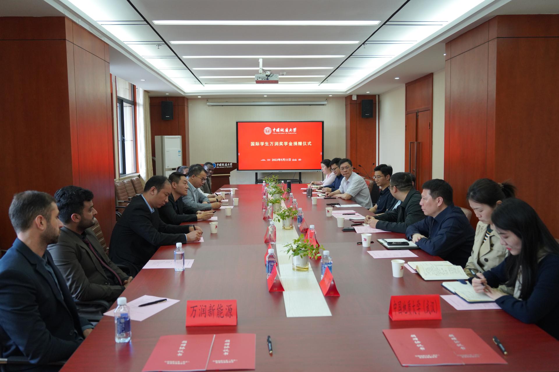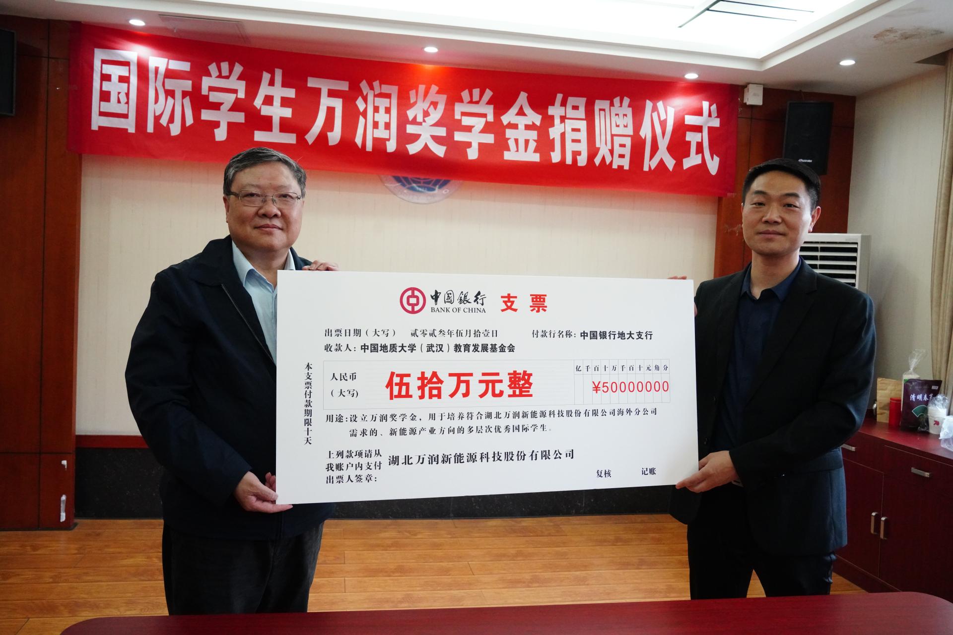 储祖旺为万润新能源颁发捐赠证书,并代表学校接收“万润奖学金”捐赠支票。他对万润新能源的捐赠表示感谢,对公司积极承担社会责任与社会公益表示赞赏。他指出,“万润奖学金”的设立是双方合作良好的开端,既有利于推动学校来华留学教育服务“一带一路”建设,加快“全球地大”及学校国际化事业步伐,为培养“知华、友华、爱华”的国际学生提供“地大方案”;也是产教融合、汇聚行业和大学优质资源培养国际学生的校企合作新模式,助力万润新能源选贤募才,储备企业紧缺型国际人力资源,提高参与全球竞争的能力。他希望校企双方今后在人才培养、科技合作等方面更加紧密联系,不断推进全方面的深度合作,实现校企共赢。