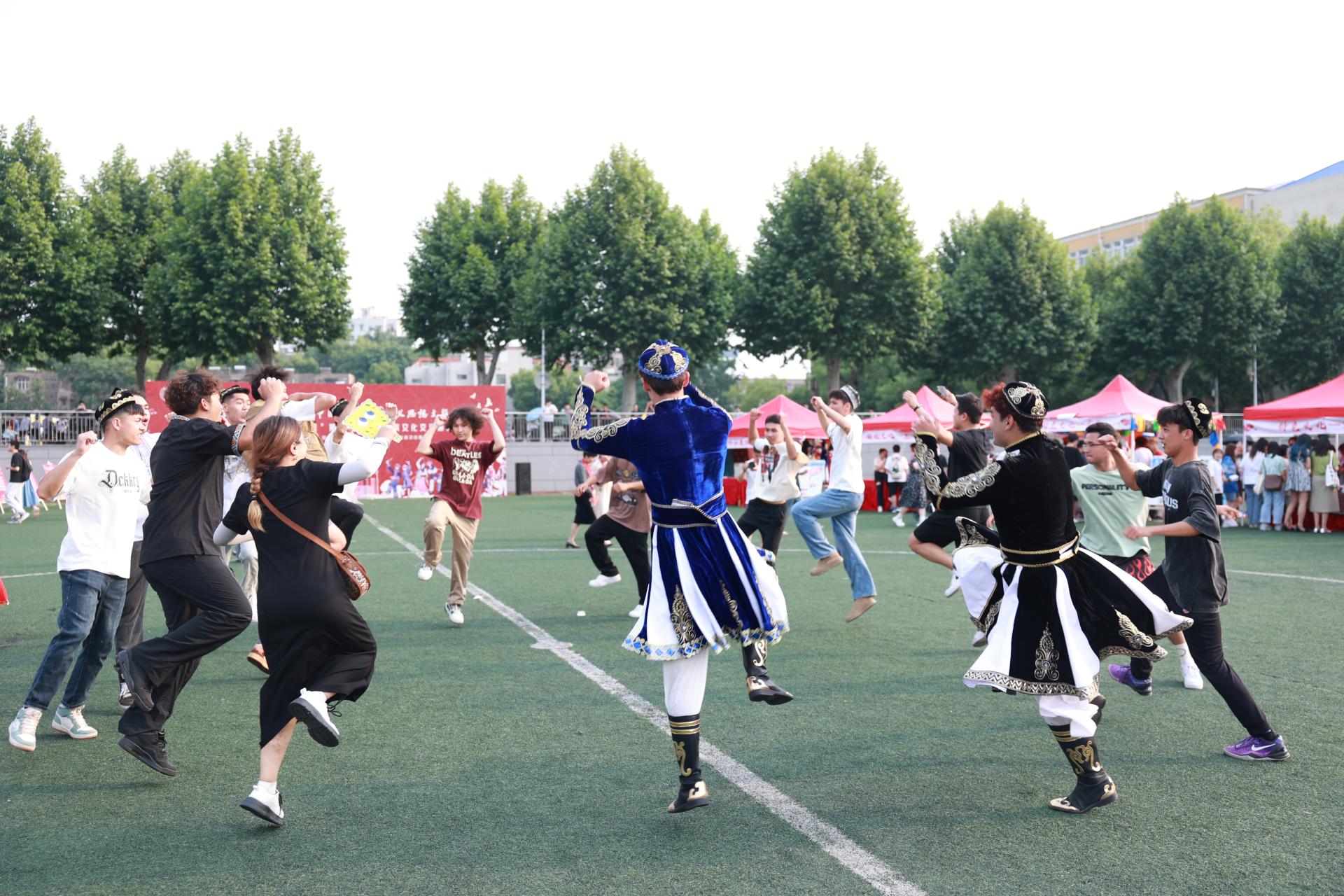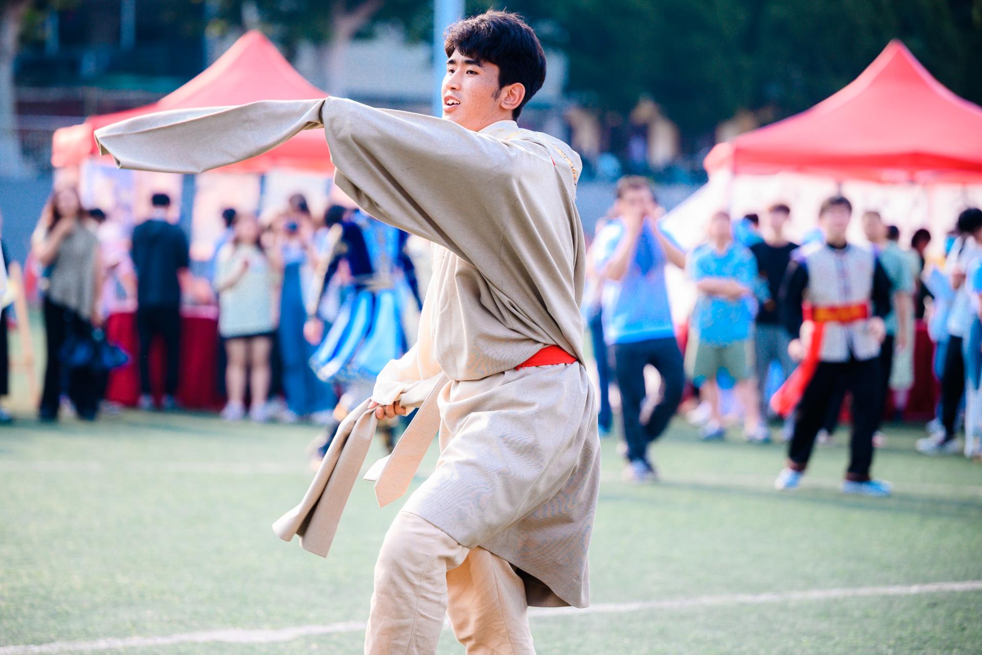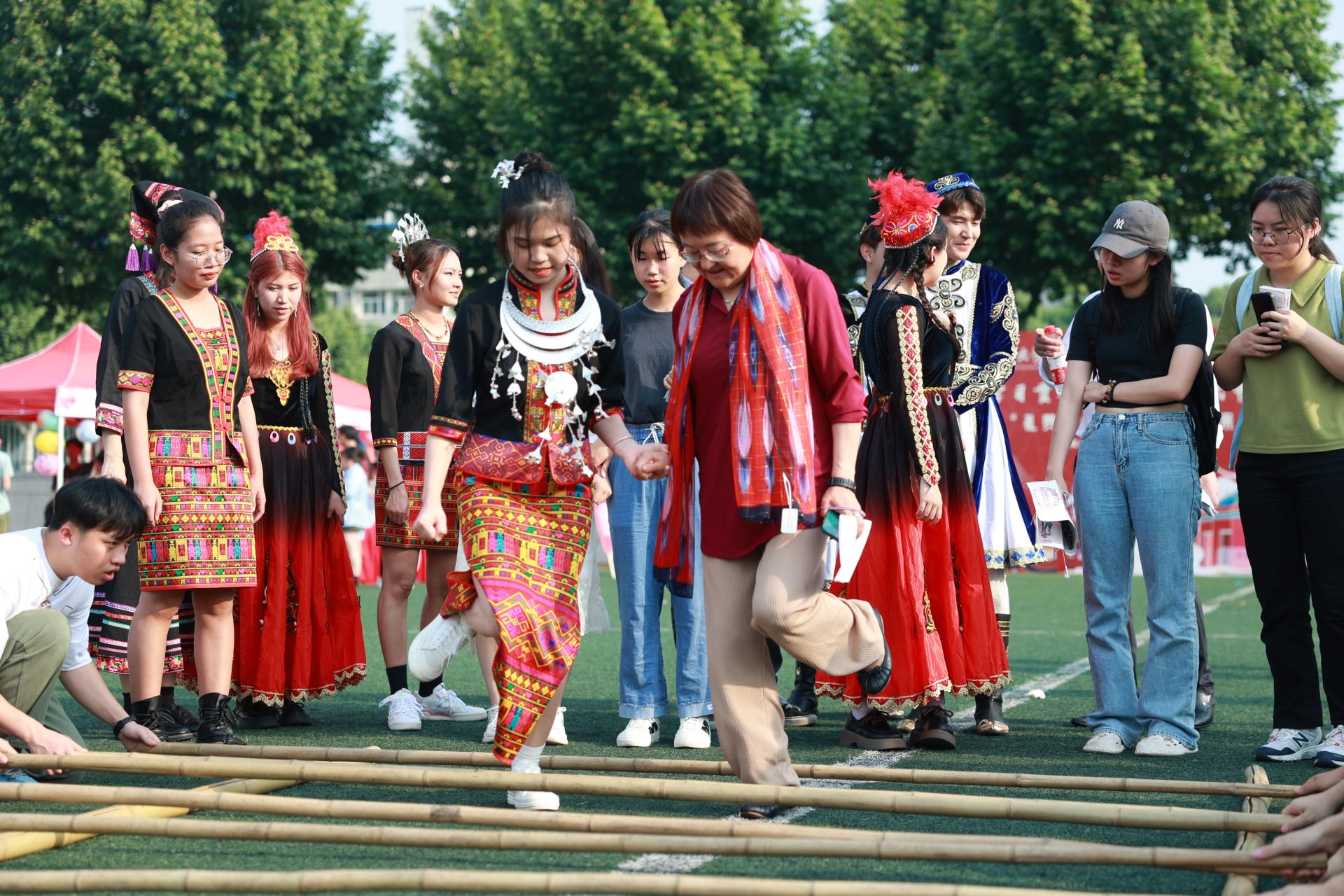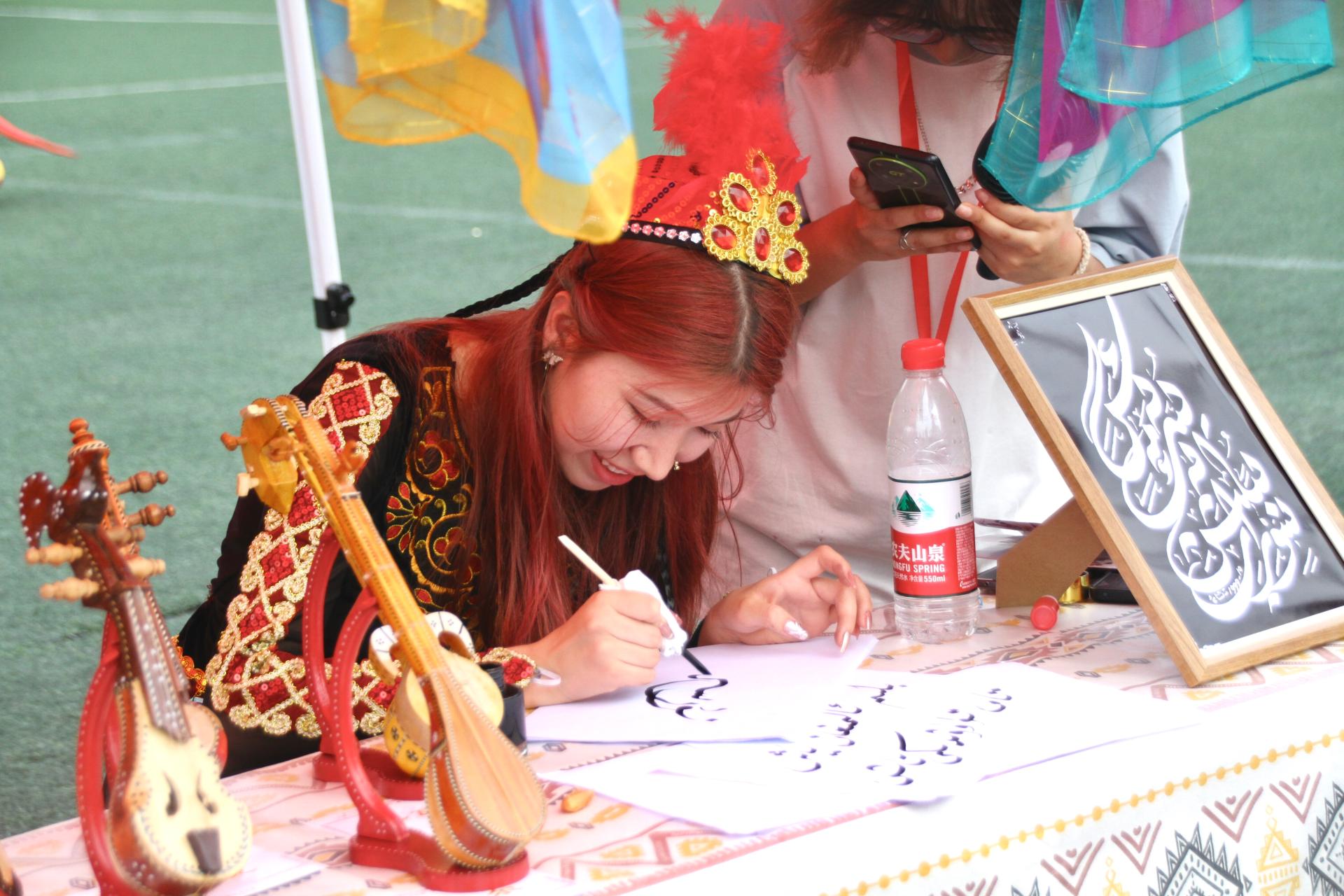 中华文化交流及民族体育竞技环节,包含主题教育知识竞答、民族特色文化展示、优秀非遗文化及服饰妆造体验等20余个展位、100余项特色体验项目,押加、投壶等9个民族传统体育运动竞技,热闹非凡。活动现场,师生通过同学一理论、同抚一台琴、同下一盘棋、同书一卷字、同作一幅画、同起一曲舞、同射一把箭等环节,沉浸式体验中华民族文化,铸牢中华民族共同体意识。