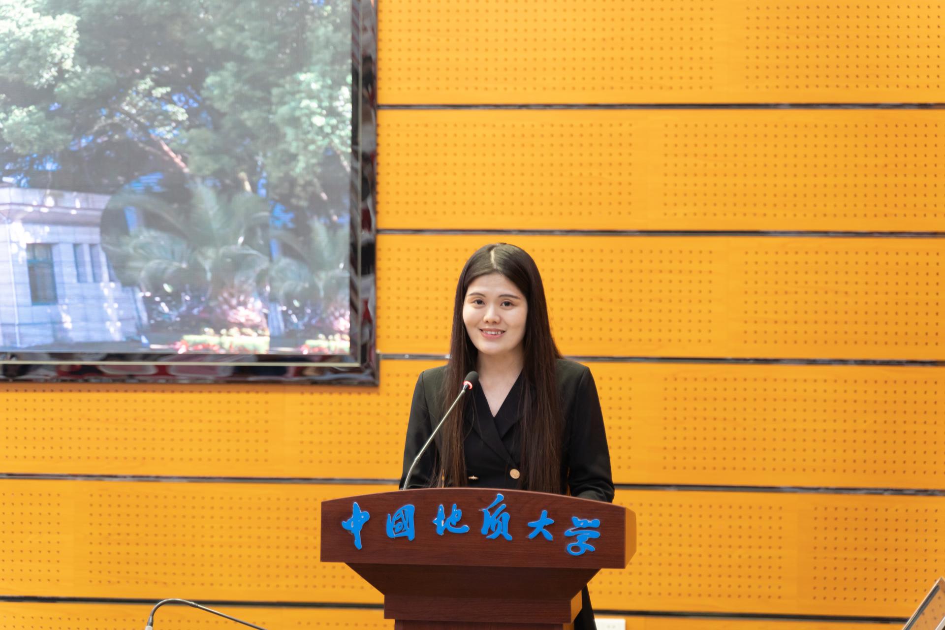 马克思主义学院硕士毕业生刘丹作为2023届校友大使代表发言。她阐述了身为地大人的母校情谊和家国情怀,她号召2023届校友大使始终秉持为全体校友服务的宗旨,履行校友大使工作职责,热心校友工作,弘扬地大精神,传播母校好声音,联络校友感情,时刻关注母校发展。