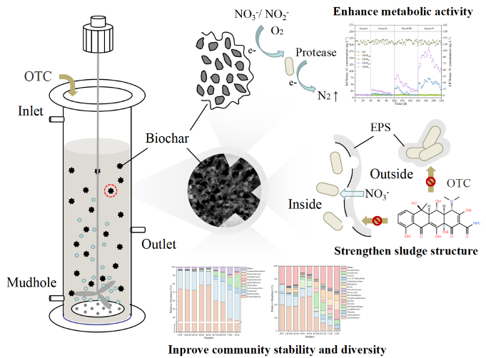 生物炭强化土霉素胁迫下好氧反硝化系统稳定性的主要机制模式图