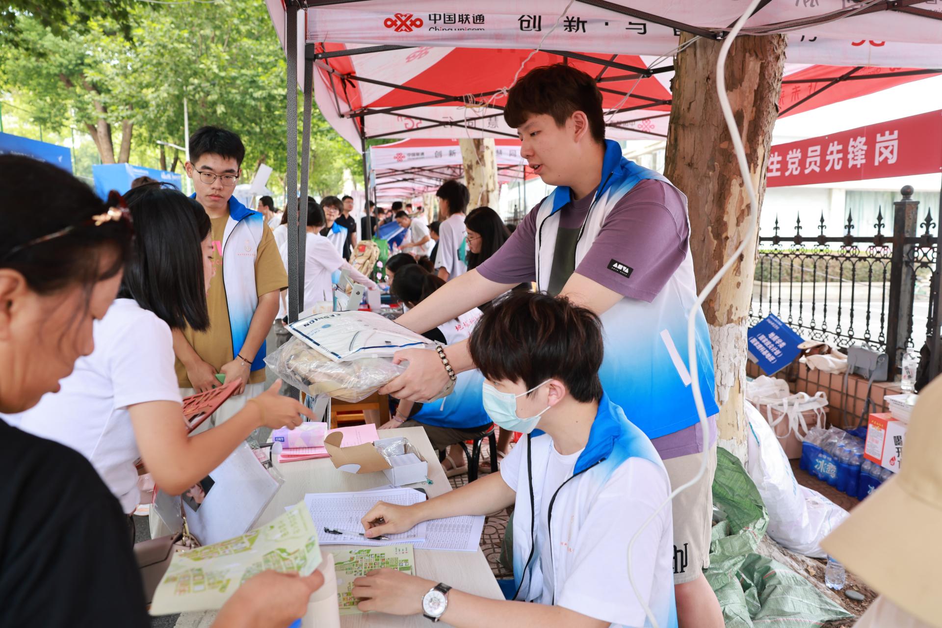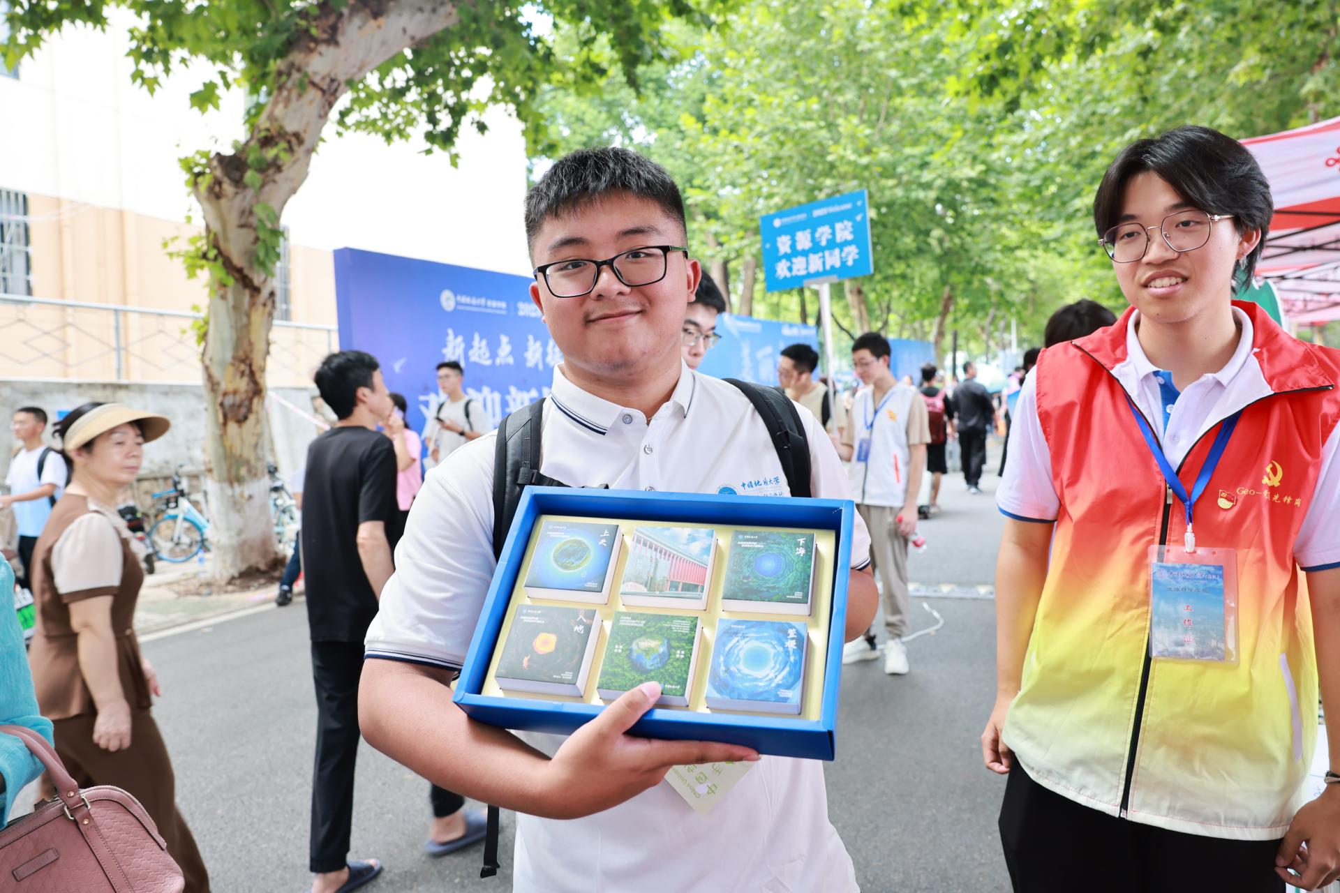 在地球科学学院迎新点,一位高高壮壮的男生在给新生发放大礼包,他是地球科学学院新生贾梓杰,这位来自北京的大男孩非常热心,刚报到完就穿上志愿者服装,和学长学姐们一起为新生服务。