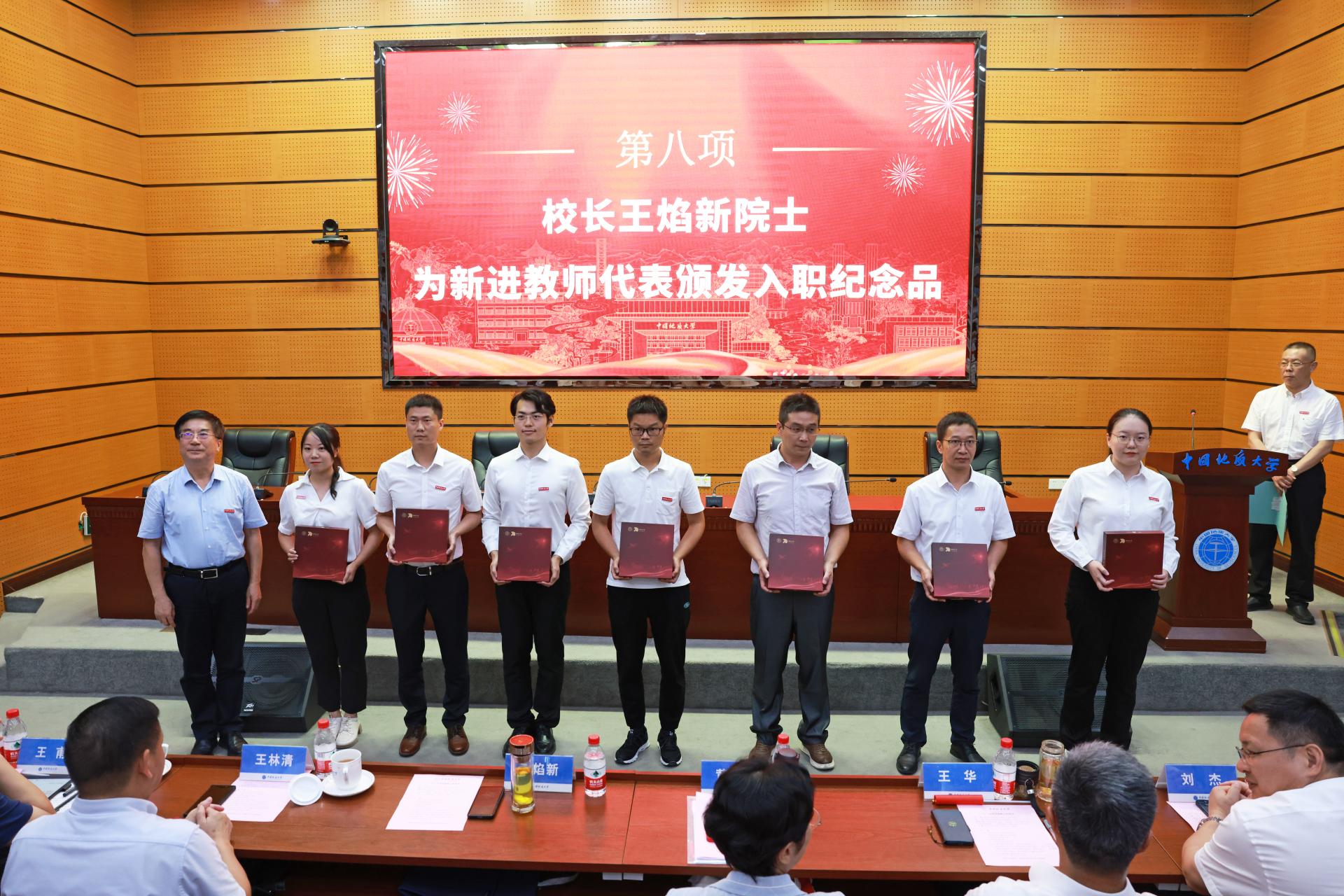 王焰新为新进教师代表颁发校徽及入职纪念品。