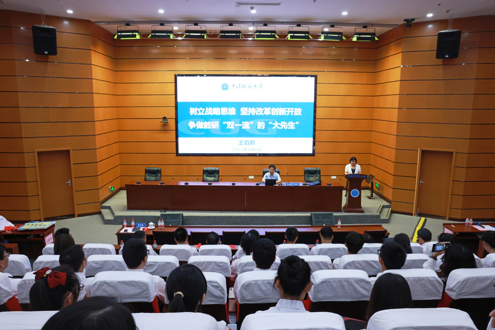 仪式结束后,王焰新以《树立战略思维 坚持改革创新开放 争做教研“双一流”的“大先生”》为全体新进教师作专题辅导。