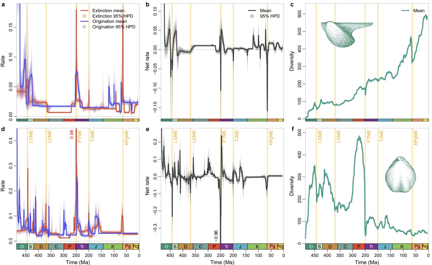 腕足类和双壳类动物具有相似的形态以及生态位置的重叠,自19世纪六十年代起,人们即假设两者具有竞争关系,具有生理优势的双壳类逐步取代了古生代劣势的腕足类。然而,也有不同观点认为两者不存在竞争关系,而是二叠纪—三叠纪之交大灭绝事件导致了这次转换。为了解决这一争论,研究团队利用高性能计算机,对五亿年来的近33万条关于腕足动物和双壳动物化石记录进行了厘定和修正,用贝叶斯生态模拟的分析方法,计算出这两类生物长时间尺度的新生与灭绝速率。结果表明两者在侏罗纪之前具有彼此相似的多样性速率演化趋势,证明两者均受到主要环境事件的影响(图3)。