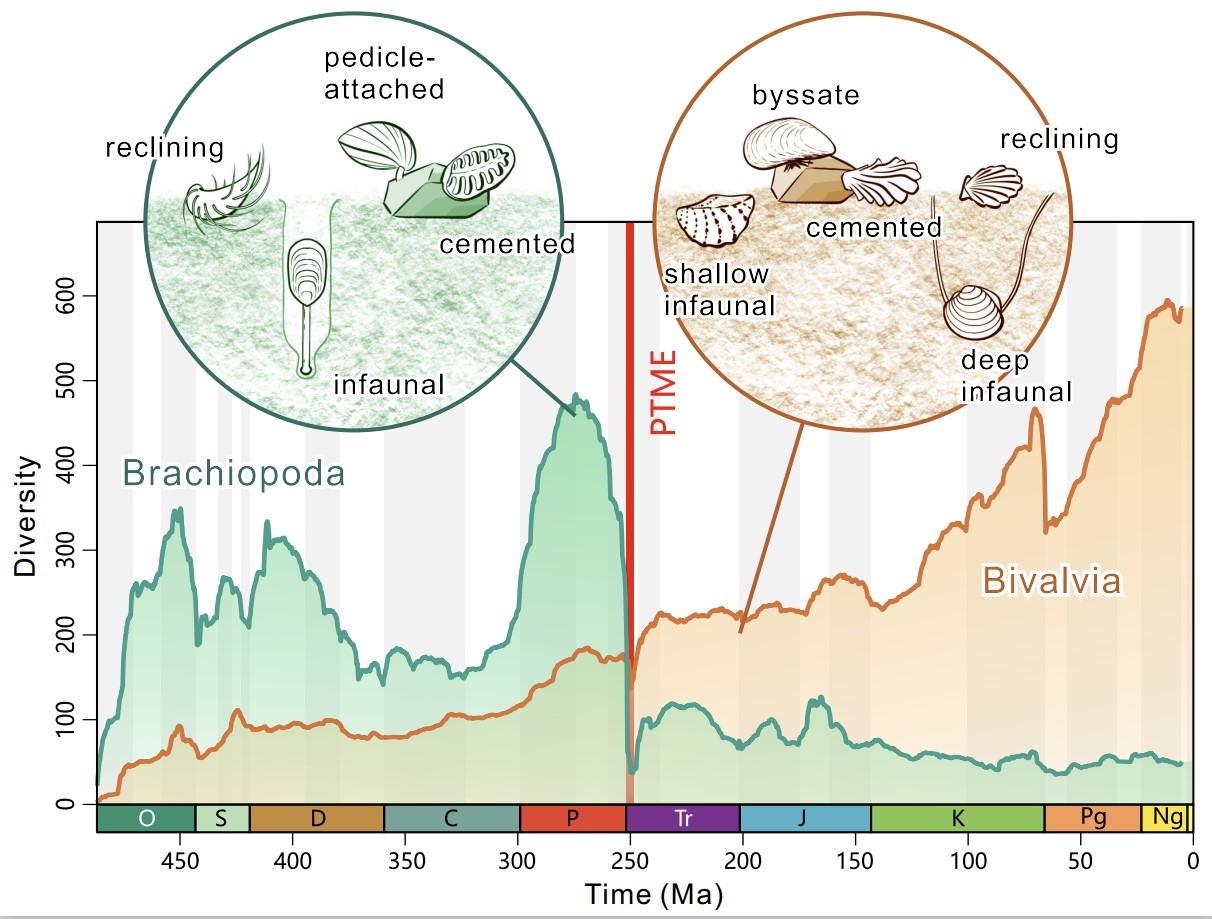 Guo, Z., Flannery-Sutherland, J.F., Benton, M.J., Chen, Z.-Q. 2023. Bayesian analyses indicate bivalves did not drive the downfall of brachiopods following the Permian-Triassic mass extinction. Nature Communications, 14, 5566.https://doi.org/10.1038/s41467-023-41358-8
