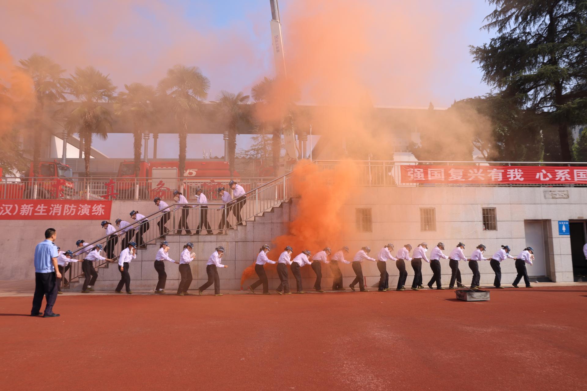 为了增强学生消防安全意识,了解防火和逃生的知识技能,安全保卫部联合关山消防救援站进行消防逃生演练。随着烟雾弹拉响,浓烟滚滚,60名学生用湿毛巾捂住口鼻,低姿从操场两侧屈身,穿越烟雾区模拟逃生,同时消防高空救援车和高空喷水灭火车也缓缓升起,对现场进行救援。