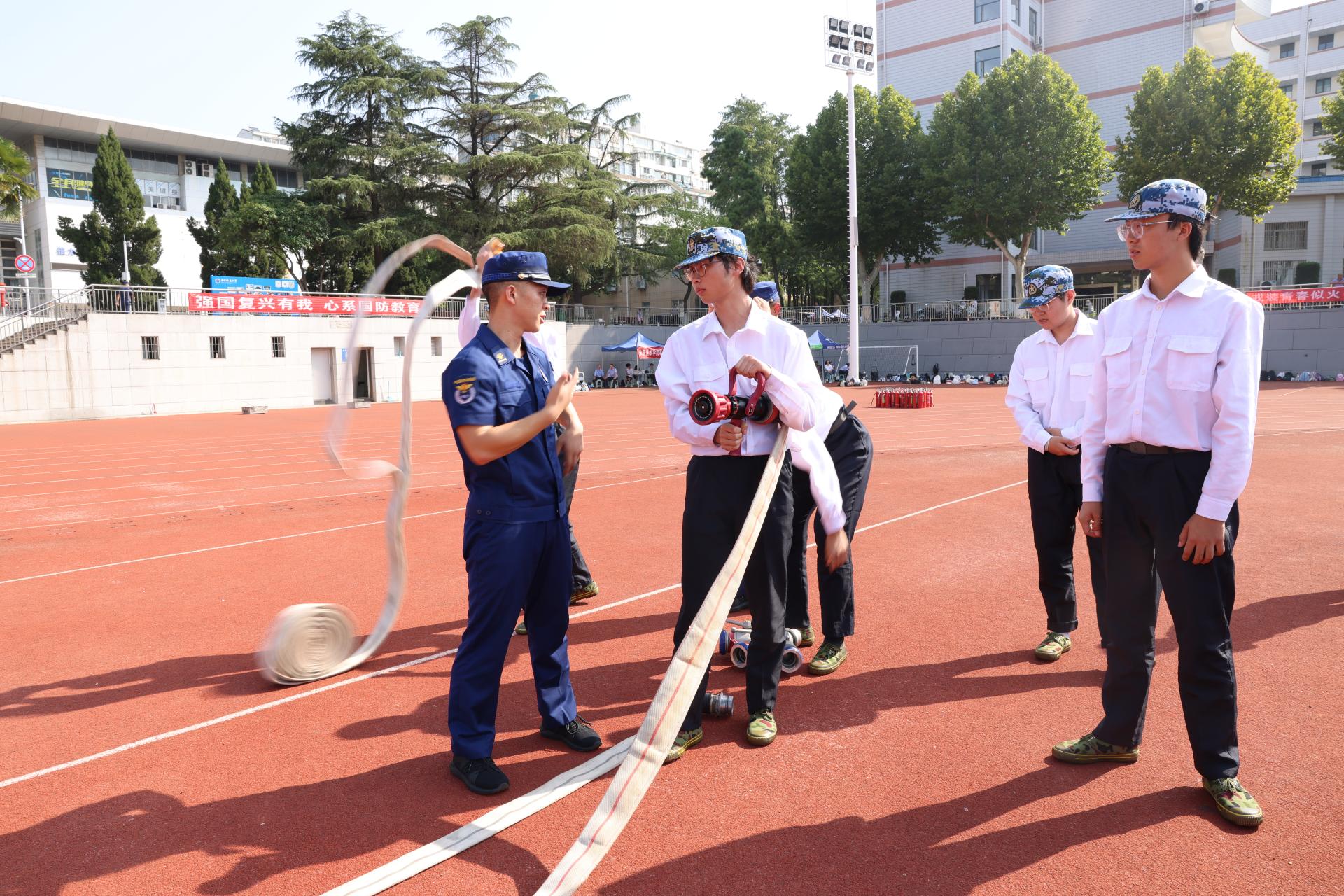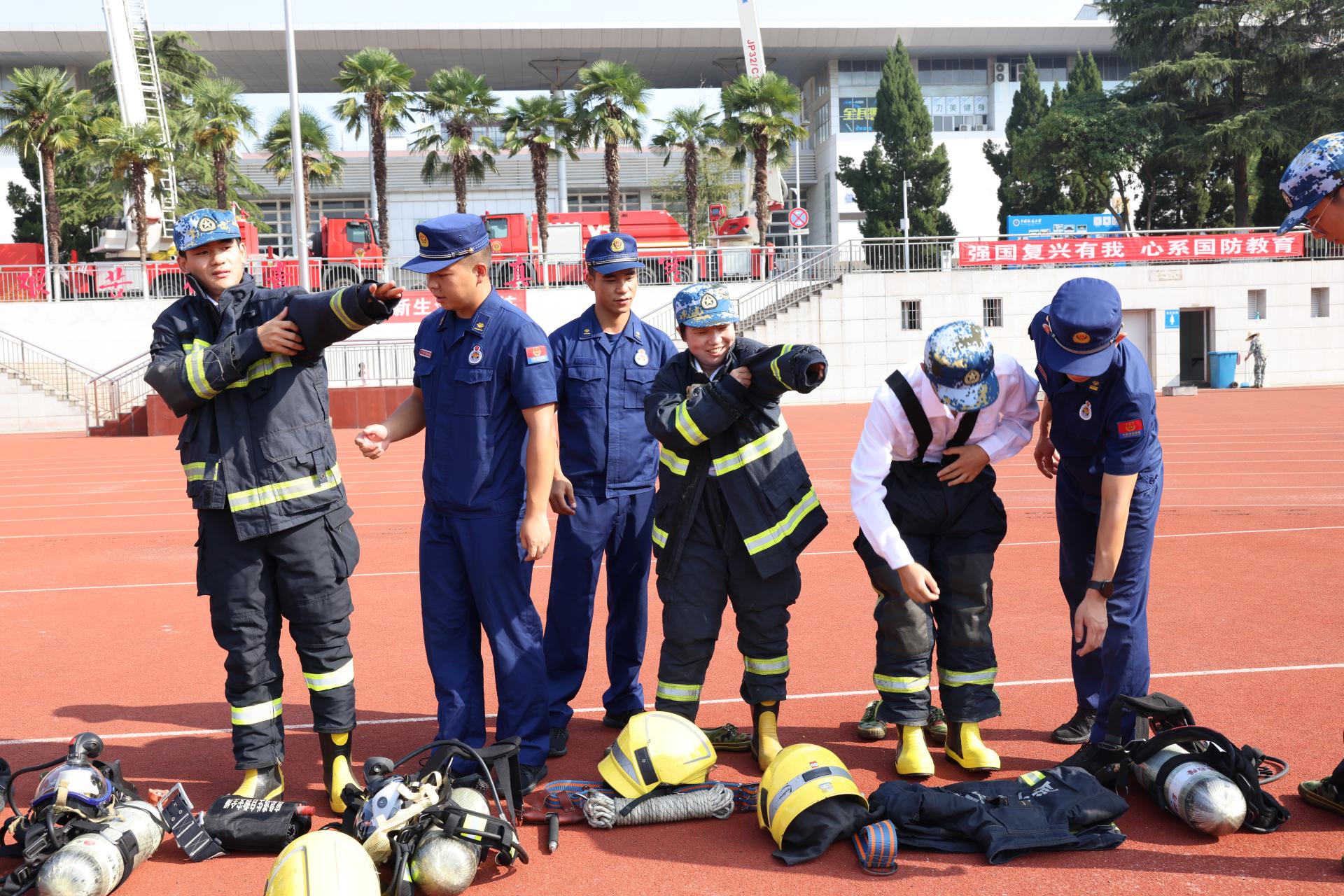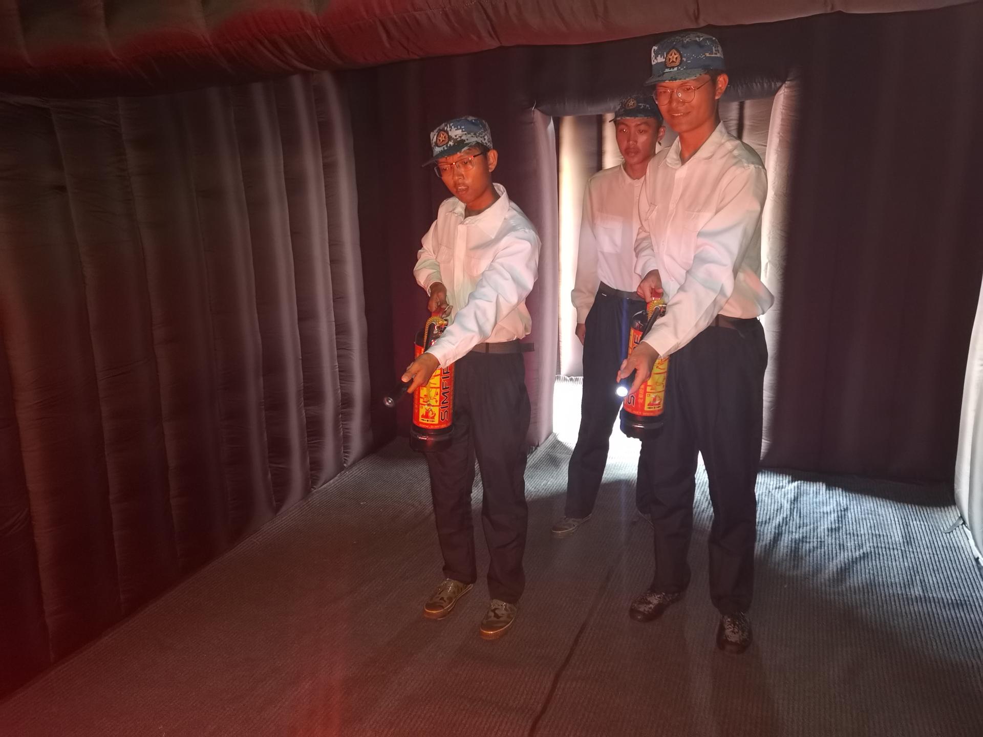 期间,消防科科长刘从贵讲解并示范了消防设备的使用方法,同学们体验了抛水带、穿消防服、佩戴逃生呼吸面罩、灭火器等实操演练。