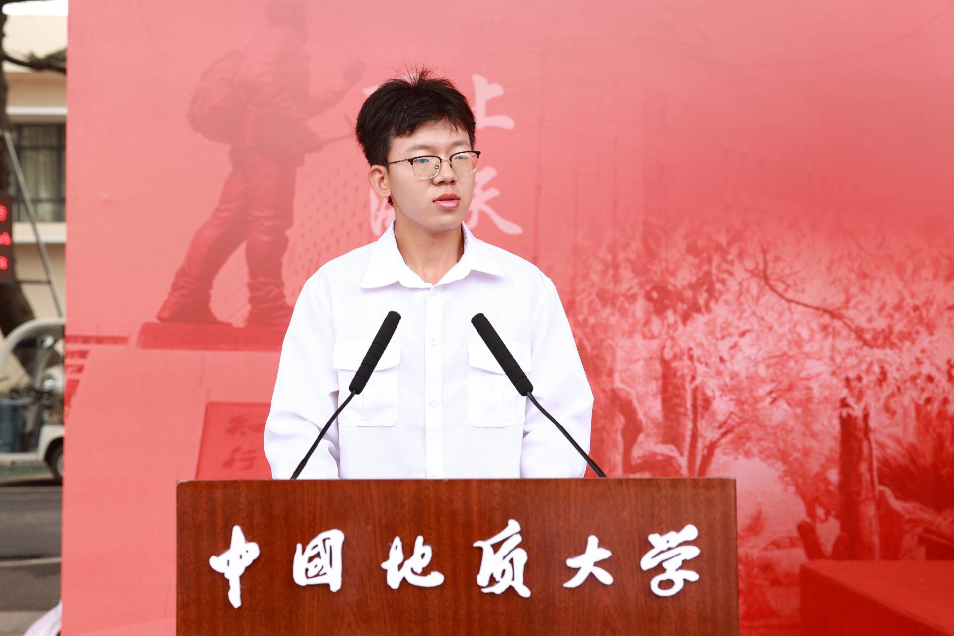 新生代表、环境学院杨博超来自内蒙古阿拉善沙漠,他说和他爷爷一样一代又一代的治沙“愚公”,用生命守护着阿拉善不被沙漠吞噬,如何更好科学防治风沙,让绿水青山成为家乡人民的金山银山是他奋斗的目标。他表示将初心如磐、勇攀高峰,和同学们一起,在地大学有所成、学有所获,为建设美丽中国贡献力量。