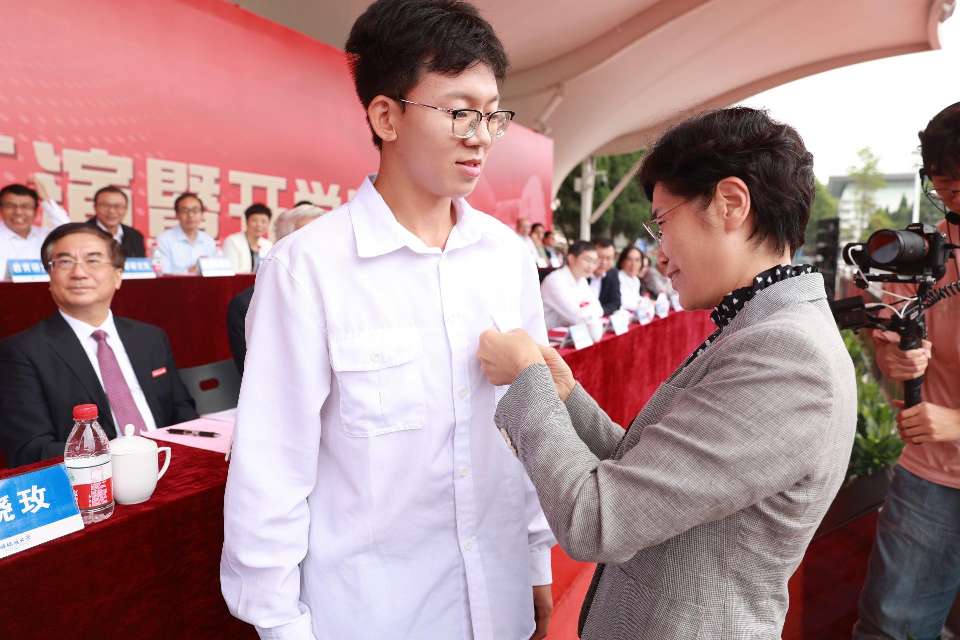 校党委书记黄晓玫为本科新生代表佩戴校标。全体本科新生佩戴菲律宾欧博游戏官网校标,成为光荣的地大人。