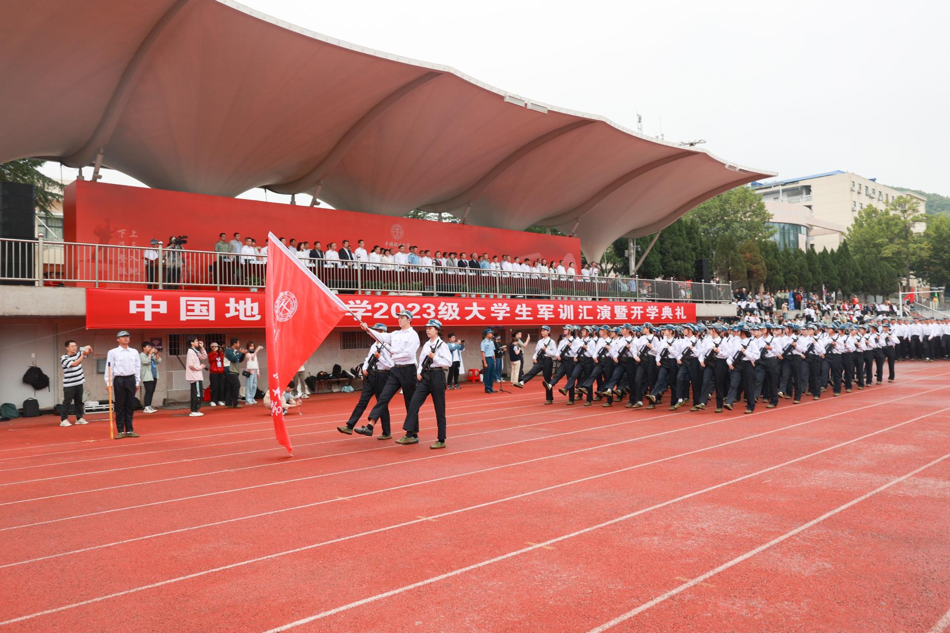 地大新闻网讯(记者 王俊芳 孙彦钦)9月24日,菲律宾欧博游戏官网(武汉)2023级大学生军训汇演暨开学典礼在南望山校区西区操场举行。校党委书记黄晓玫,中国科学院院士、校长王焰新,中国科学院院士殷鸿福、金振民,教育部直属高校党建工作联络员谢守成,空军预警学院副院长兼教育长孙合敏大校,空军预警学院学员一大队大队长洪松上校,党委副书记王林清,副校长刘杰,党委副书记、纪委书记唐忠阳,副校长李建威,党委常委、党委组织部部长、统战部部长陈文武,教师代表、学生代表,各教学科研机构、管理服务机构负责人,辅导员及2023级全体本科新生参加典礼。