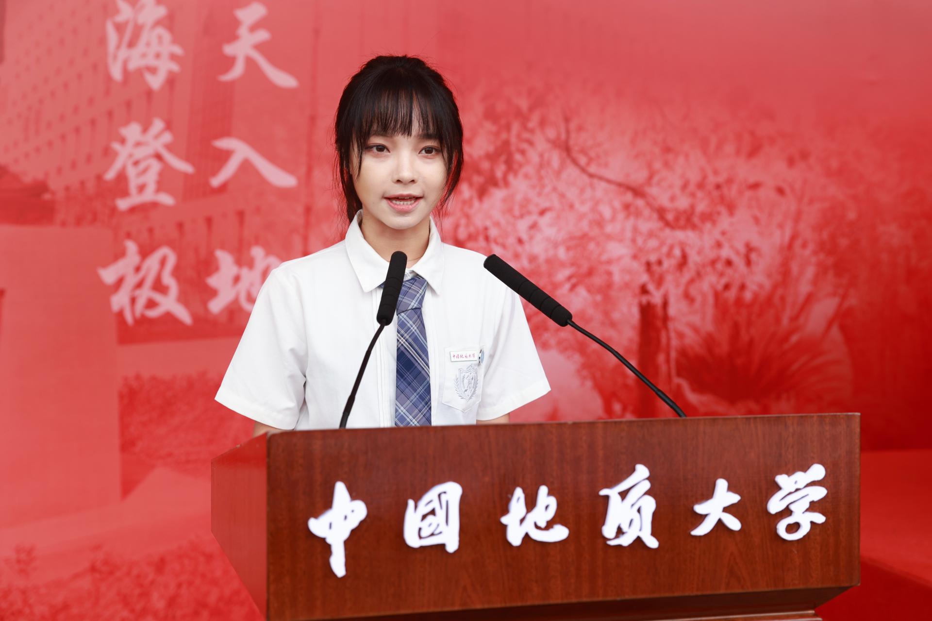 高年级学生代表、经济管理学院2021级本科生谢馨仪分享了她在地大求学的故事,鼓励新生不要羞于当“卷王”,努力奋斗,保持热爱,勇敢追逐自己的梦想,发出自己耀眼的光芒。她表示,地大这片热土,将会是大家筑梦的起点、追梦的支点、并最终指引大家到达圆梦的终点。
