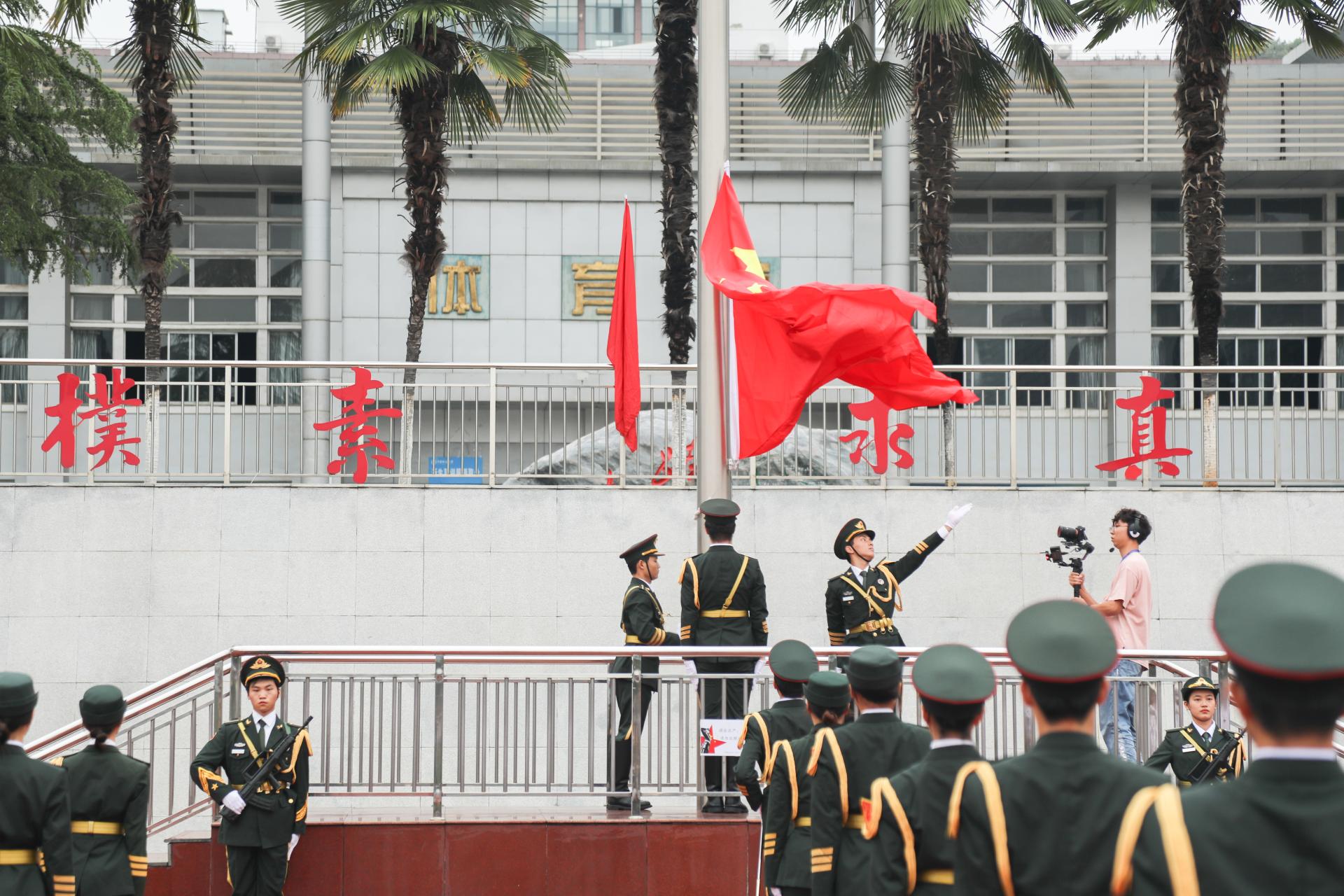 全体师生奏唱国歌,举行升旗仪式。