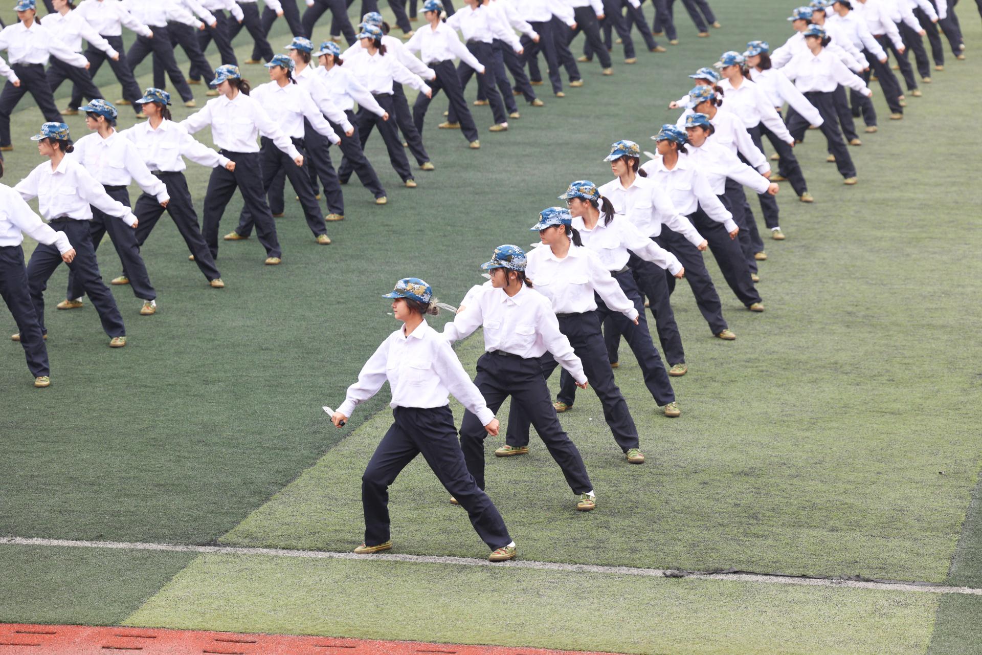 匕首操方阵由环境学院、工程学院、机械与电子信息学院、经济管理学院500名女生组成,嘹亮的口号,利落的动作,展示出地大女生巾帼不让须眉的风采。