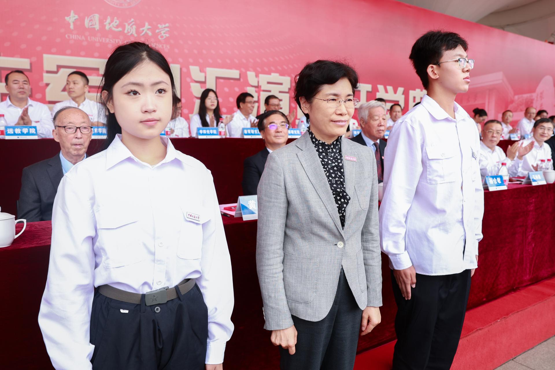 开学典礼最后,师生共同唱响校歌《勘探队员之歌》,嘹亮的歌声响彻地大校园。