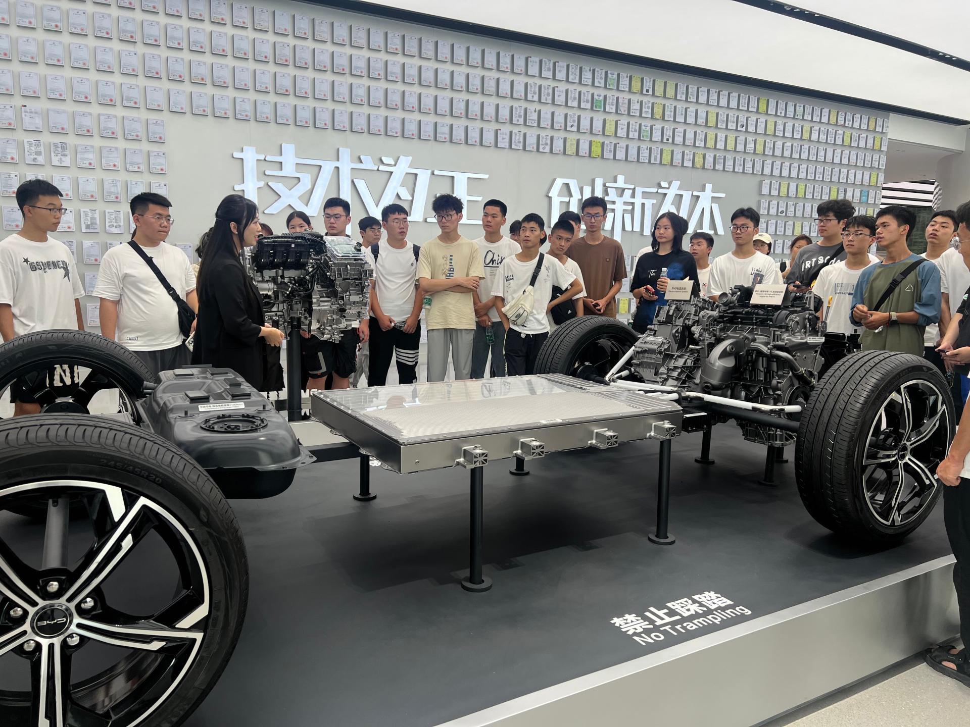 在比亚迪的展厅内陈列着在新能源汽车领域的最新的研发成果和技术创新成果,师生们切实体验了比亚迪“技术为王,创新为本”的发展理念。师生们还在工作人员的引导下,试驾了不同技术参数、外观性能的新型车型,体验了比亚迪最新技术在实际驾乘中的应用表现,现场气氛十分热烈。